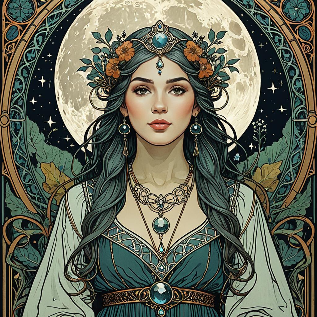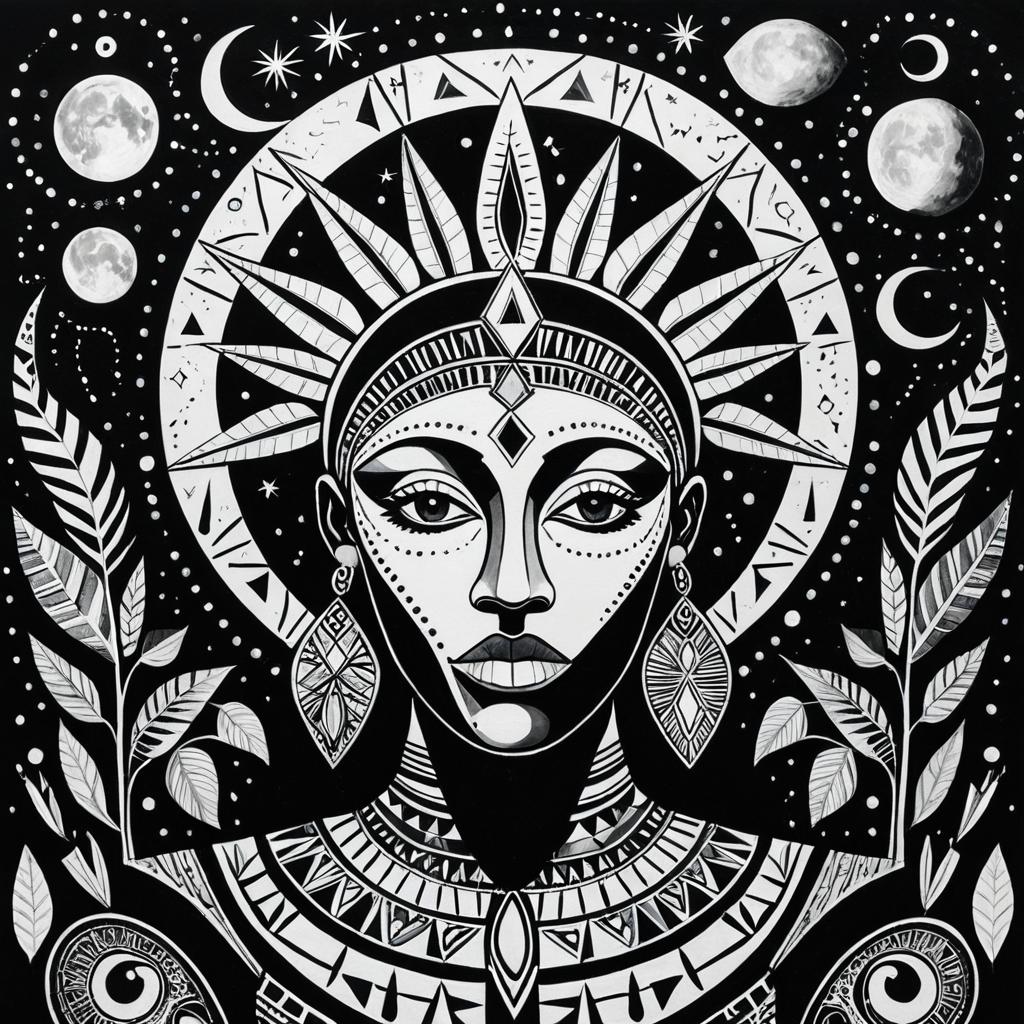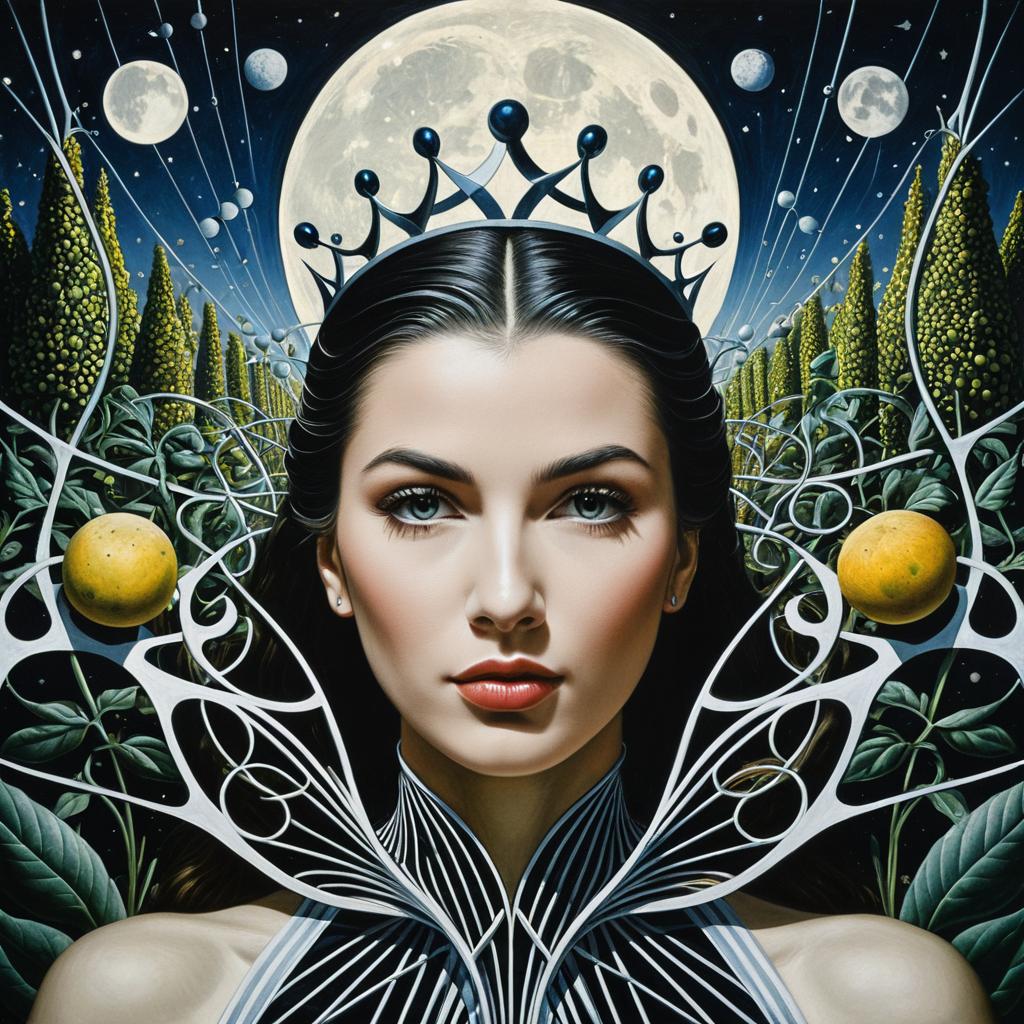 A stained glass inspired by Piet Mondrian, merging elements of Zen Buddhism with a fantastical scene. Envision a beautiful girl with captivating queen's eyes, navigating through themes of alchemy and botany, as a falling moon enhances the intricate details of this masterpiece.