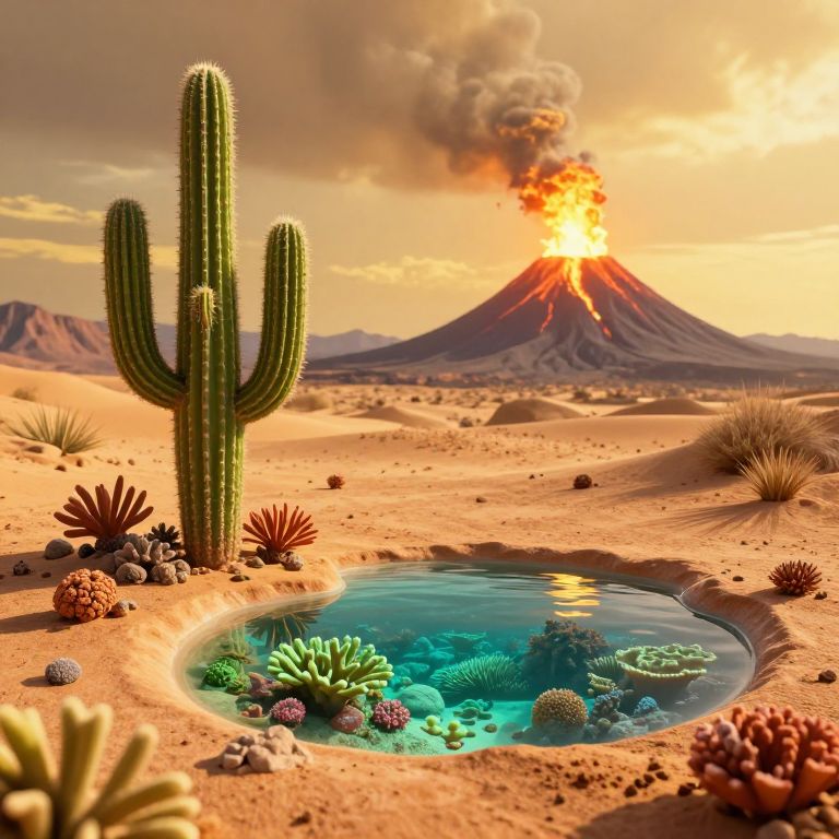 In a surreal 3D-rendered landscape, a vibrant desert cactus stands resiliently beside a tranquil pool that reveals an underwater world teeming with green coral formations, while a distant volcanic eruption bathes the scene in dramatic golden-hour lighting, blending the extremes of fire and aridity into a harmonious, high-definition hybrid ecosystem.