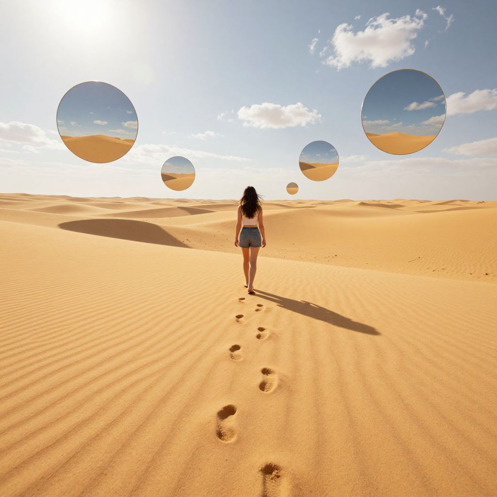A surreal 3D-rendered desert landscape features a woman walking through a vast expanse of golden sand, her path marked by footprints leading toward a series of floating circular mirrors reflecting the sky and clouds, evoking a dreamlike, high-definition visual effect where reality and imagination intertwine.