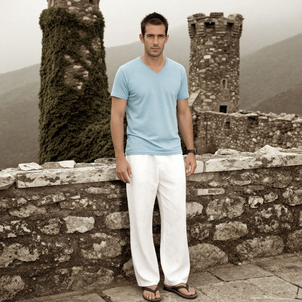 A man, black henley shirt, stone gray cuffed chinos, retro-inspired white sneakers, short-sleeve plaid shirt layered open, casual leather belt, sunset-lit battlements, technicolor analog film stock, relaxed smile, warm golden light. Man has masculine face and piercing eyes