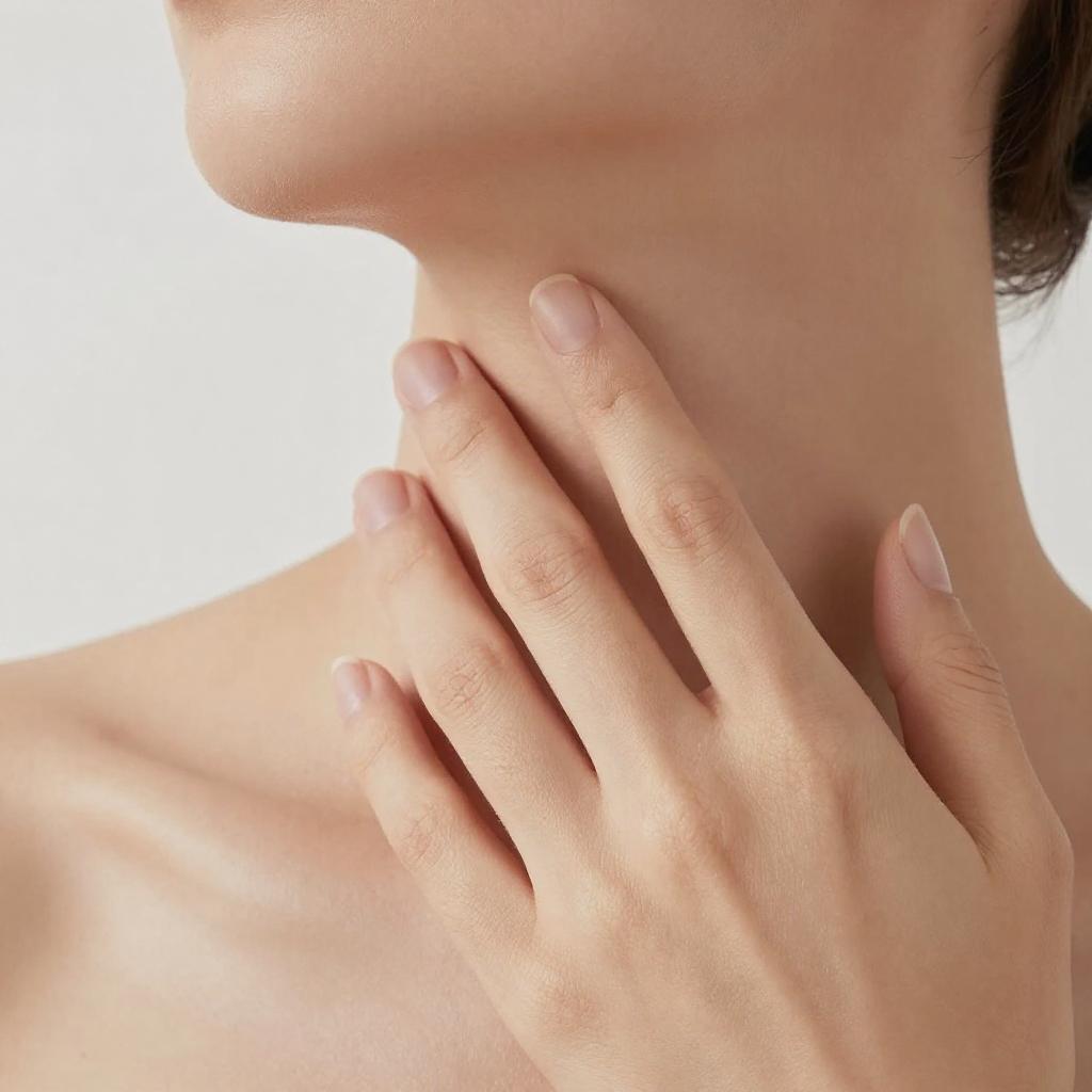 This close-up photo shows a young woman with light brown hair and closed eyes, receiving a facial massage. Her face is relaxed and serene, with two hands gently massaging her cheeks and neck. The background is softly blurred, featuring a white towel. The lighting is soft and even, highlighting her smooth skin. The camera angle is slightly above eye level, with a shallow depth of field focusing on her face.