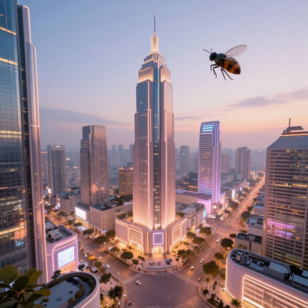 Photograph of a bustling cityscape at dusk, featuring a towering illuminated skyscraper with a flying bee in the foreground.