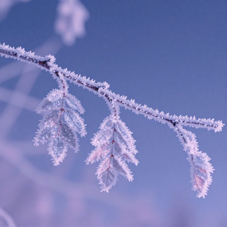 A close-up of гўrboles branches covered in sparkling frost under a starry night sky, ethereal atmosphere, delicate crystalline details on leaves, magical realism, pastel color palette with cool blue and purple hues.