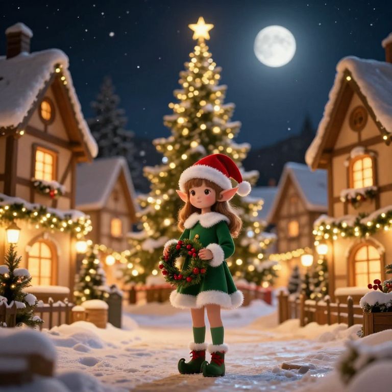 Magical Christmas Elf in Illuminated Village