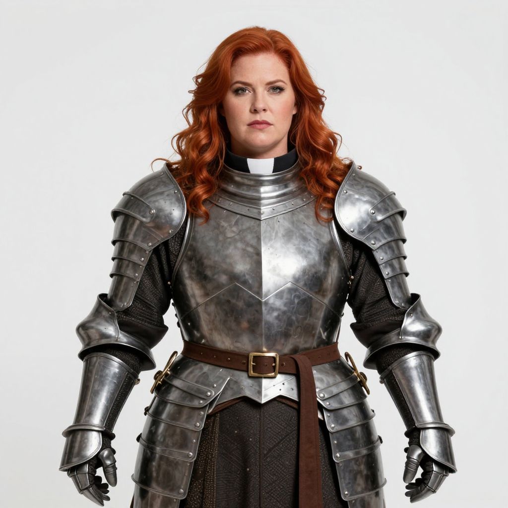 Photograph of a red-haired woman with wavy hair, wearing full silver medieval armor with black chainmail, a brown belt, and a white belt