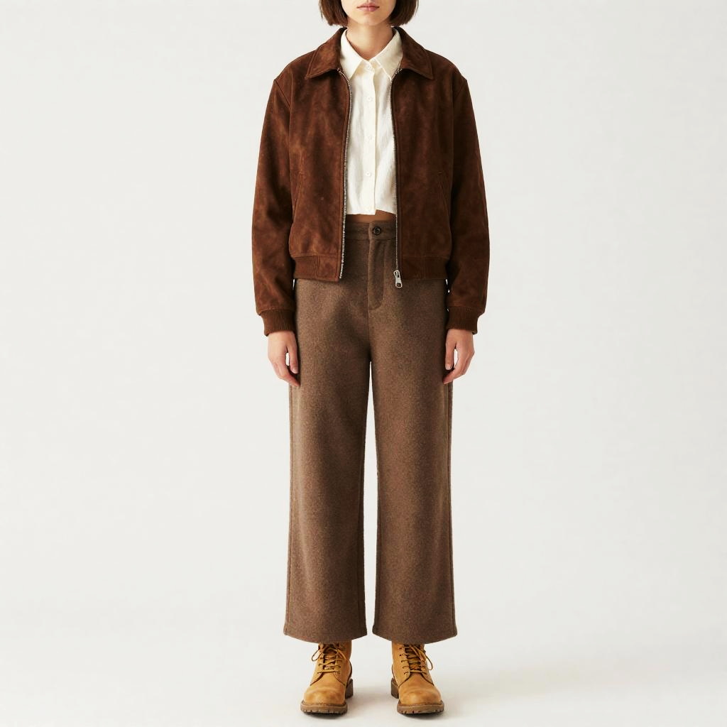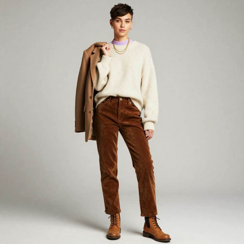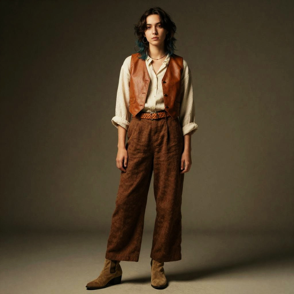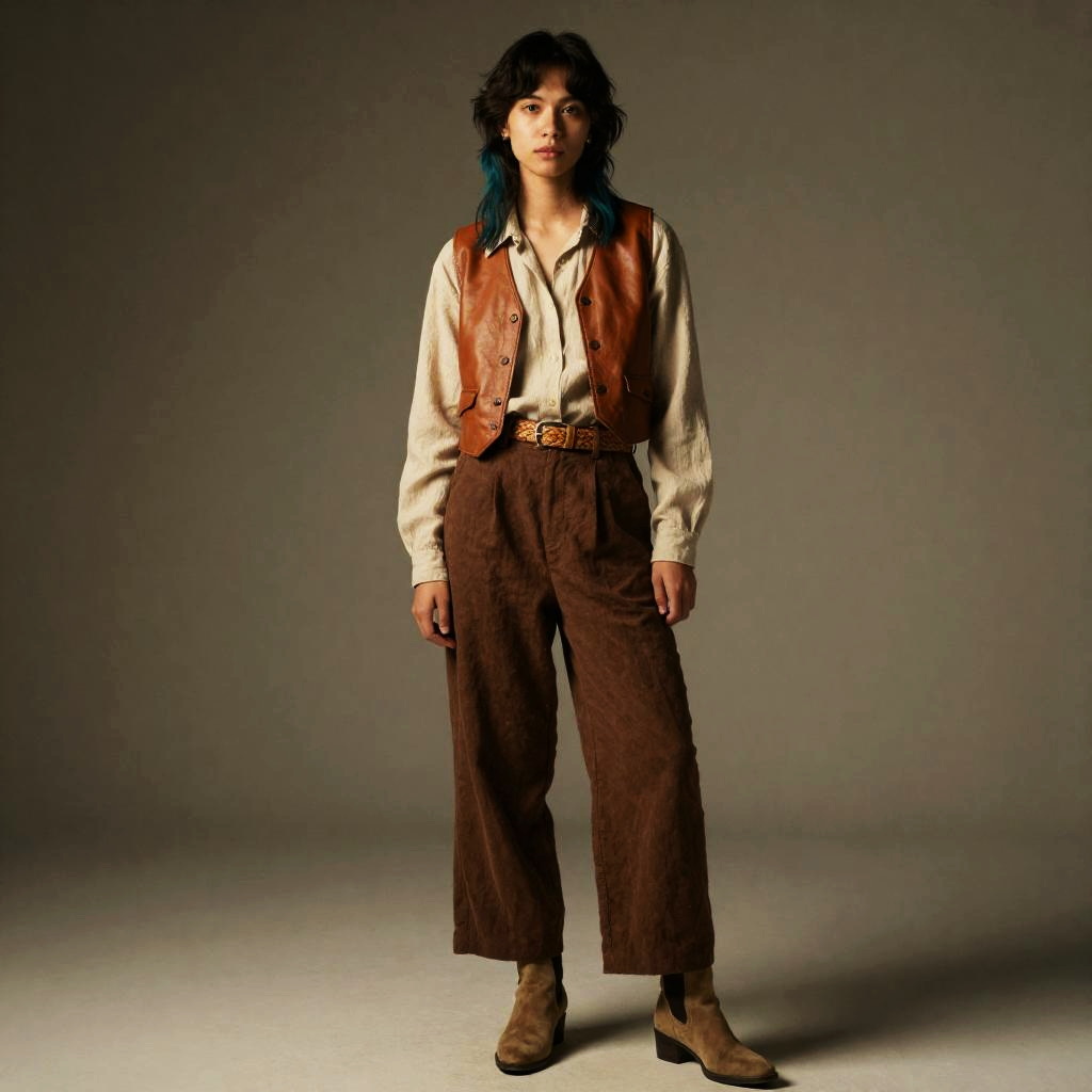 Young non-binary adult, androgynous lean, asymmetrical shoulder-length mullet with teal tips, brown pants outfit, brown wide-leg linen pants with a tucked-in ivory linen shirt, cropped caramel leather vest, woven tan belt, and tan suede ankle boots, neo-noir film grain with warm undertones