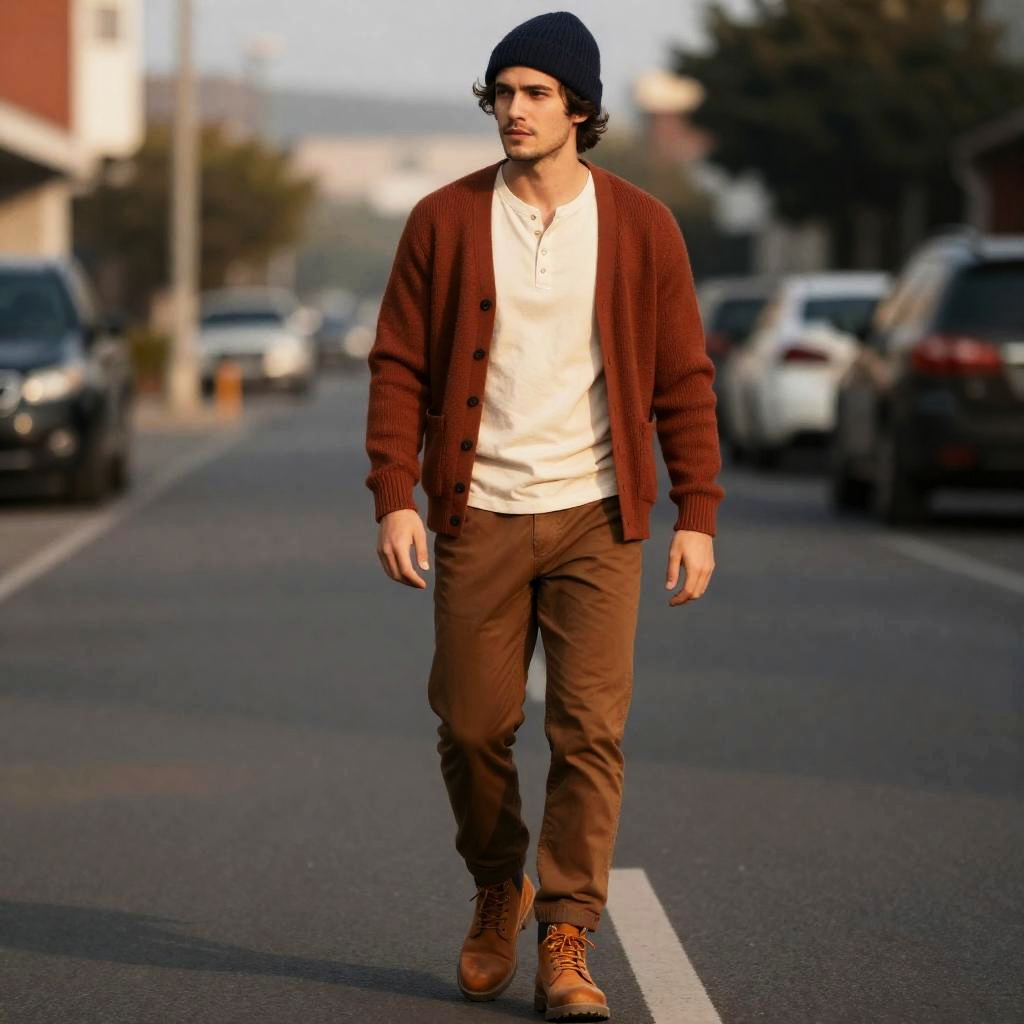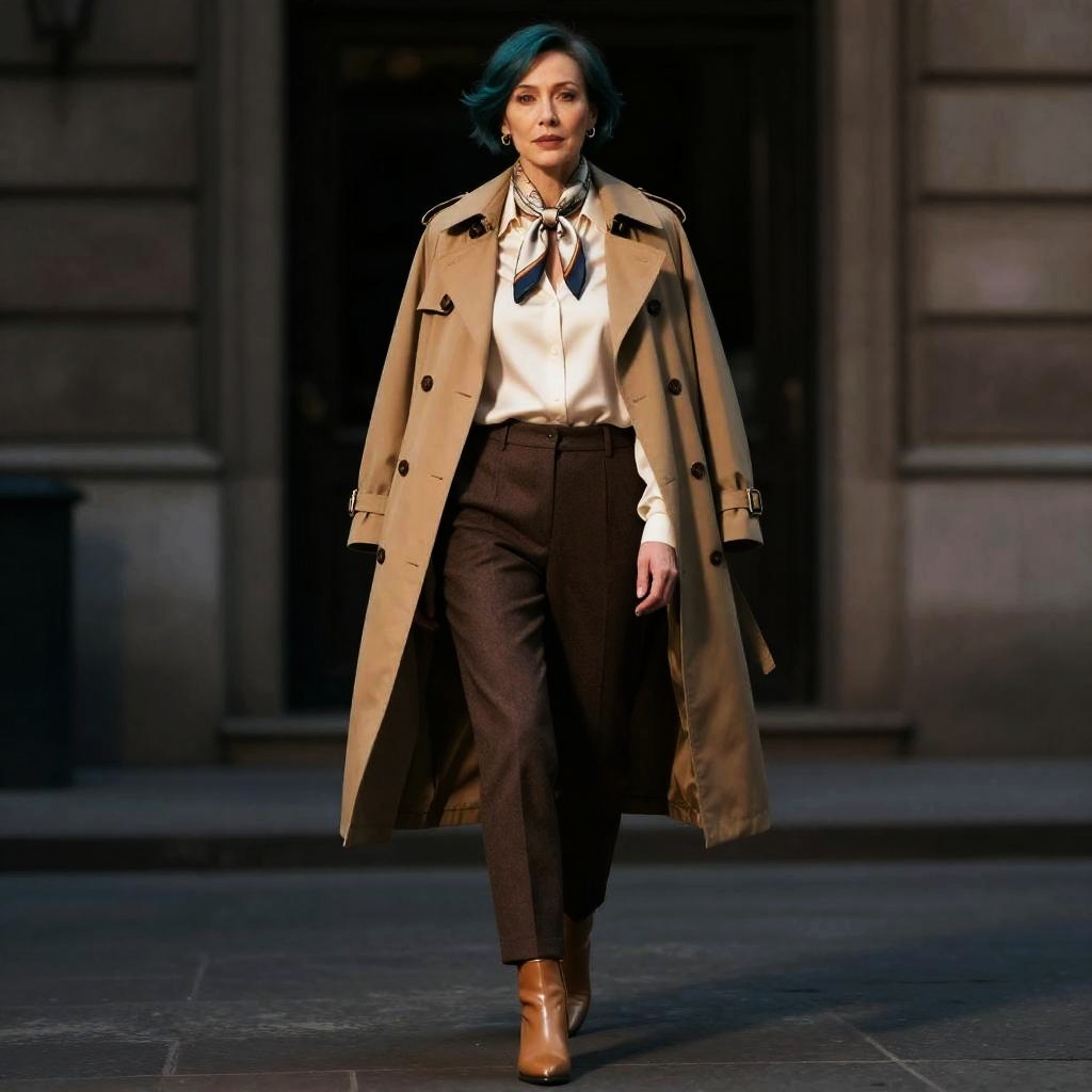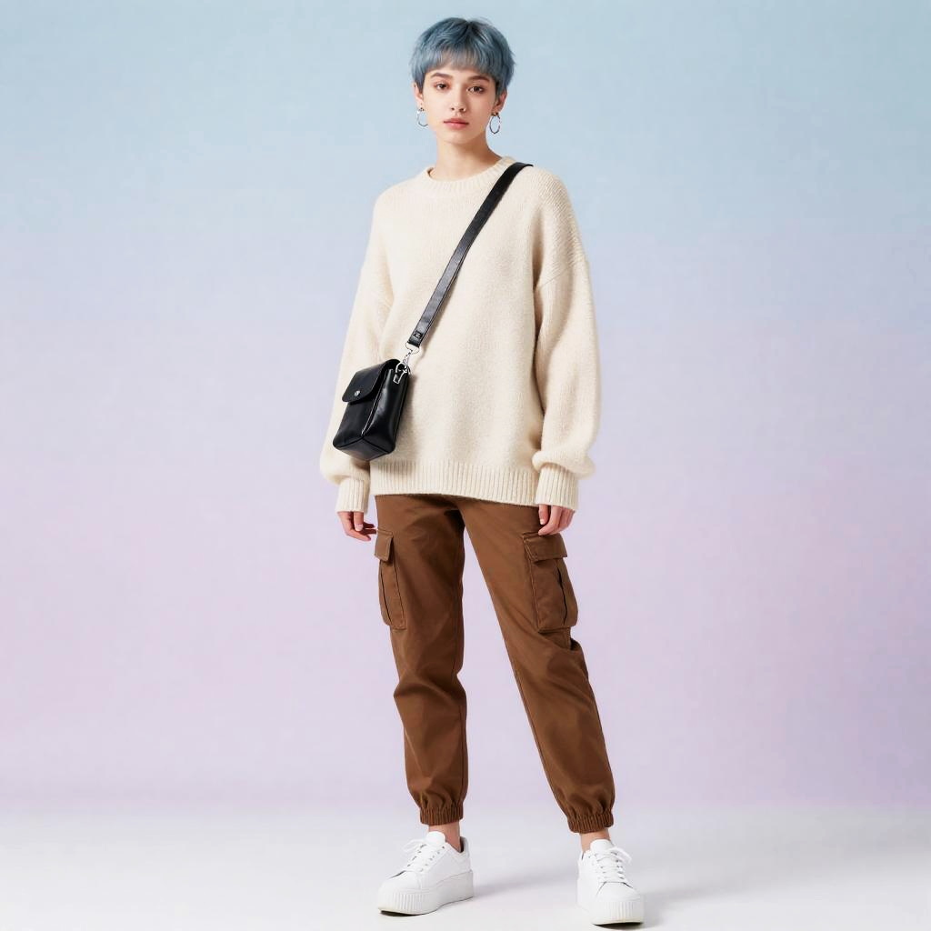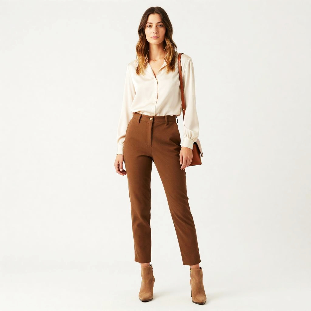 Young non-binary adult, androgynous lean, asymmetrical shoulder-length mullet with teal tips, brown pants outfit, brown wide-leg linen pants with a tucked-in ivory linen shirt, cropped caramel leather vest, woven tan belt, and tan suede ankle boots, neo-noir film grain with warm undertones