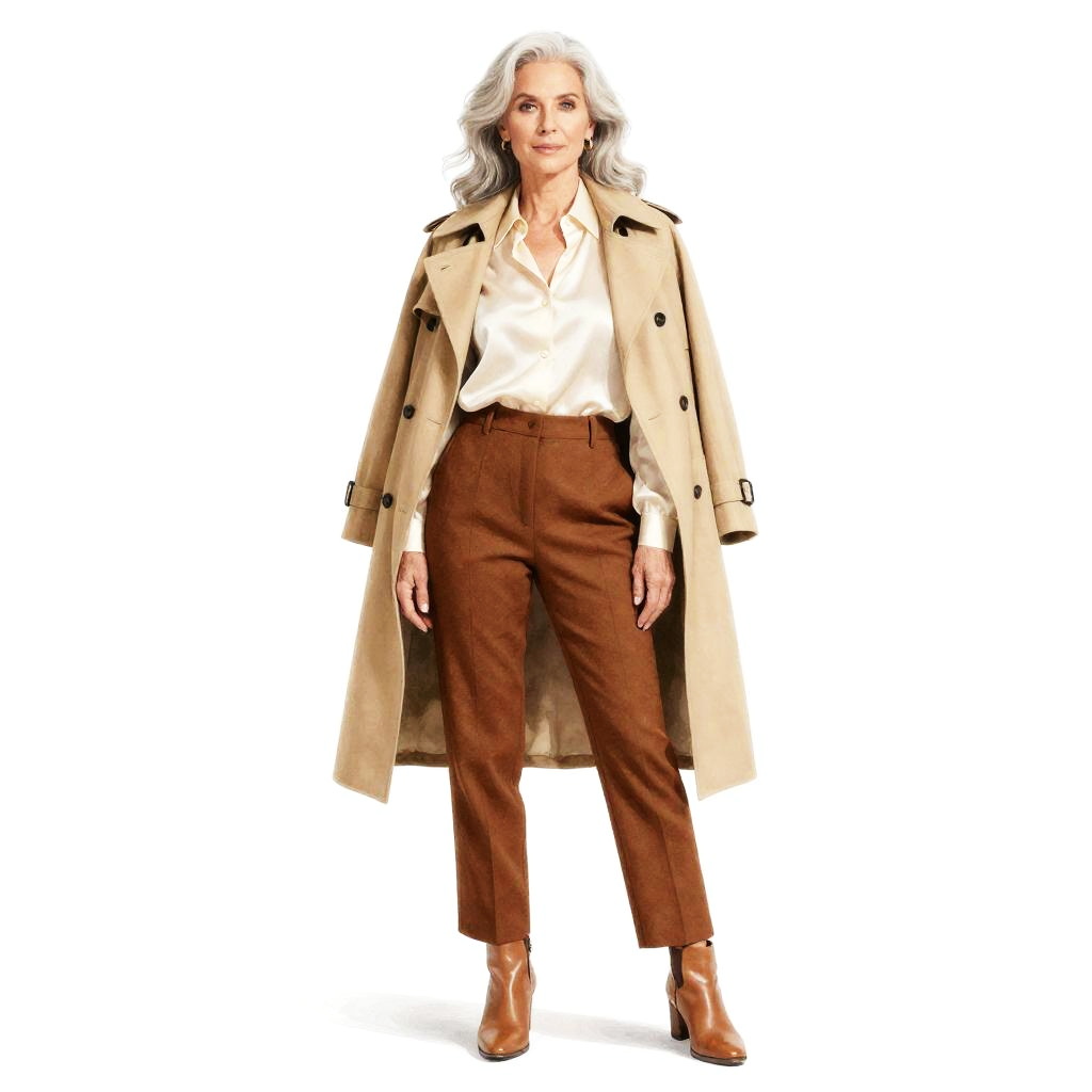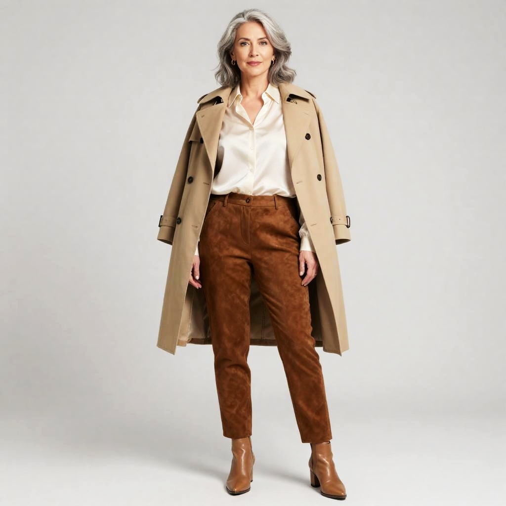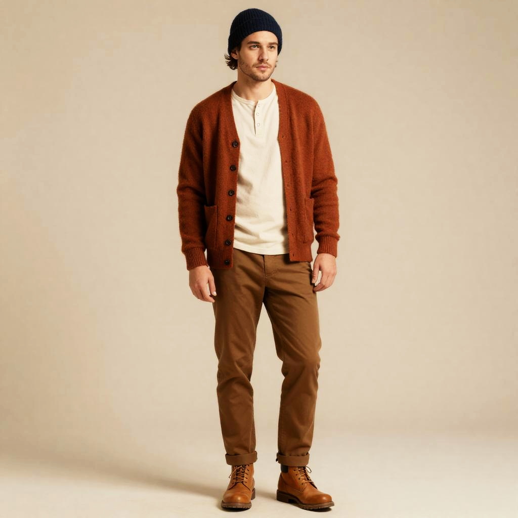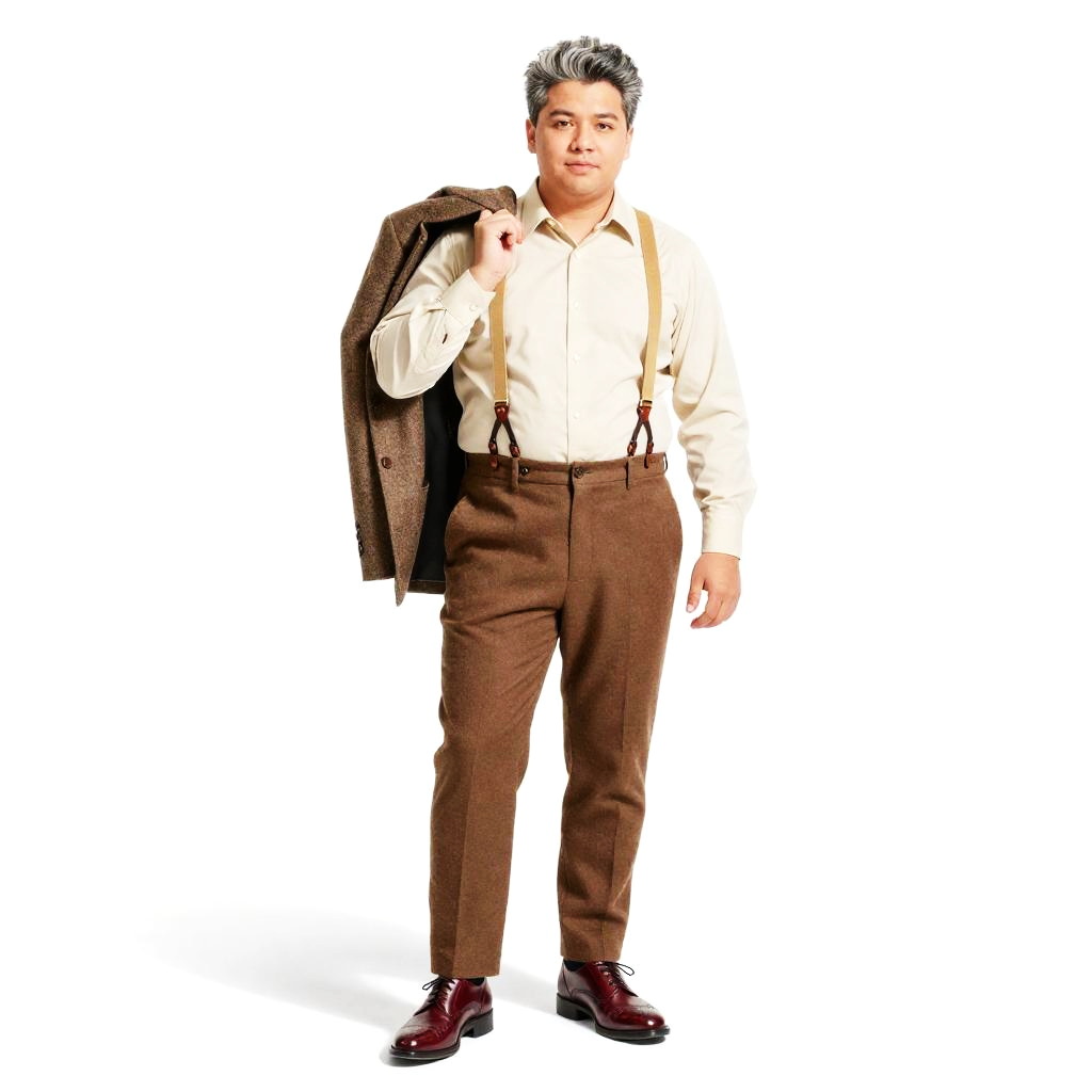 Young non-binary adult, androgynous lean, asymmetrical shoulder-length mullet with teal tips, brown pants outfit, brown wide-leg linen pants with a tucked-in ivory linen shirt, cropped caramel leather vest, woven tan belt, and tan suede ankle boots, neo-noir film grain with warm undertones