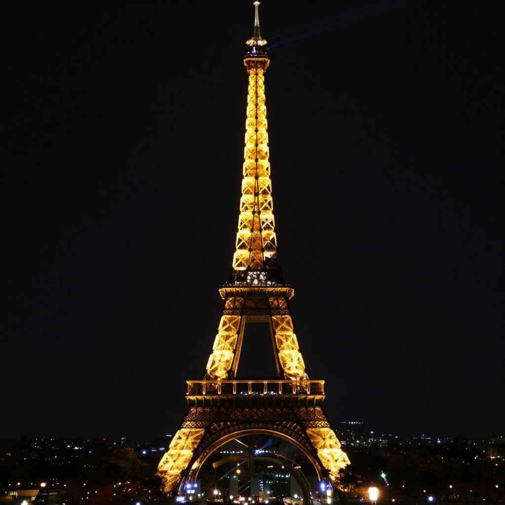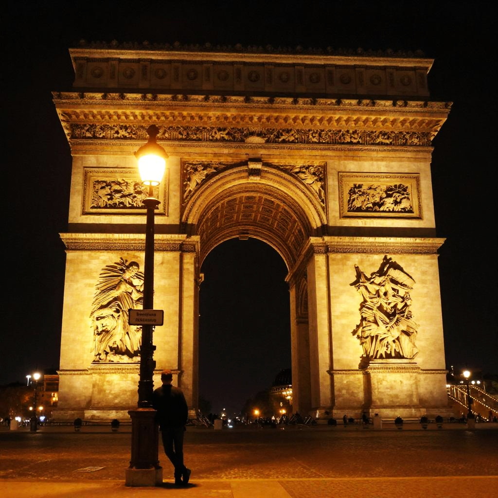 A nighttime photograph of the Arc de Triomphe in Paris, illuminated in bright yellow-orange light. A lone figure, dressed in dark clothing, stands to the left, leaning against a streetlamp. The streetlamp has a sign attached. The background shows a glowing, illuminated wall. The sky is dark, contrasting sharply with the vivid, warm lighting. The overall effect is dramatic and surreal.