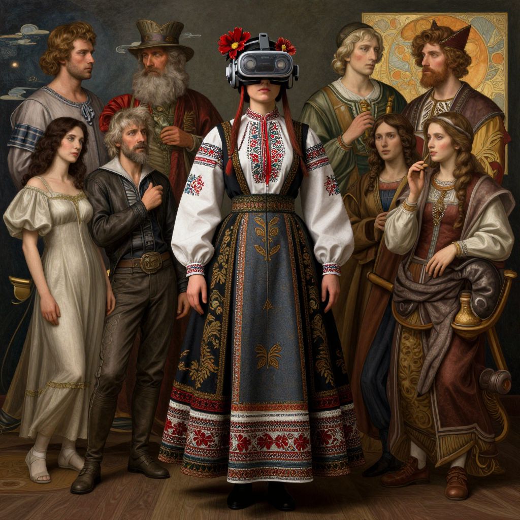 Colour caravaggio style full body portrait photography of highly detailed beautiful woman wearing detailed ukrainian folk costume designed by taras shevchenko with 1000 years perfect face wearing highly detailed retrofuturistic vr headset designed by josan gonzalez. many details in style of josan gonzalez and mike winkelmann and andgreg rutkowski and alphonse muchaand and caspar david friedrich and stephen hickman and james gurney and hiromasa ogura. rendered in blender and octane render volumetric natural light