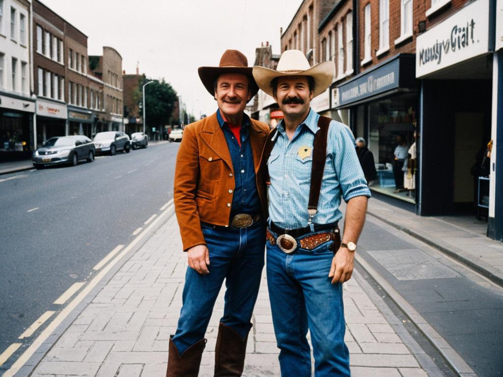 Photograph of two men standing on a city street, both wearing cowboy hats and Western attire. The man on the left has a brown jacket, blue shirt, and dark jeans, while the man on the right wears a light blue shirt, brown belt with a large buckle, and blue jeans. Both have mustaches and are smiling. The background features a street with parked cars, brick buildings, and a storefront with a sign reading "CountryGuitar." The sidewalk is paved with gray tiles, and the sky is overcast. The image has a slight vignette effect and vibrant colors.