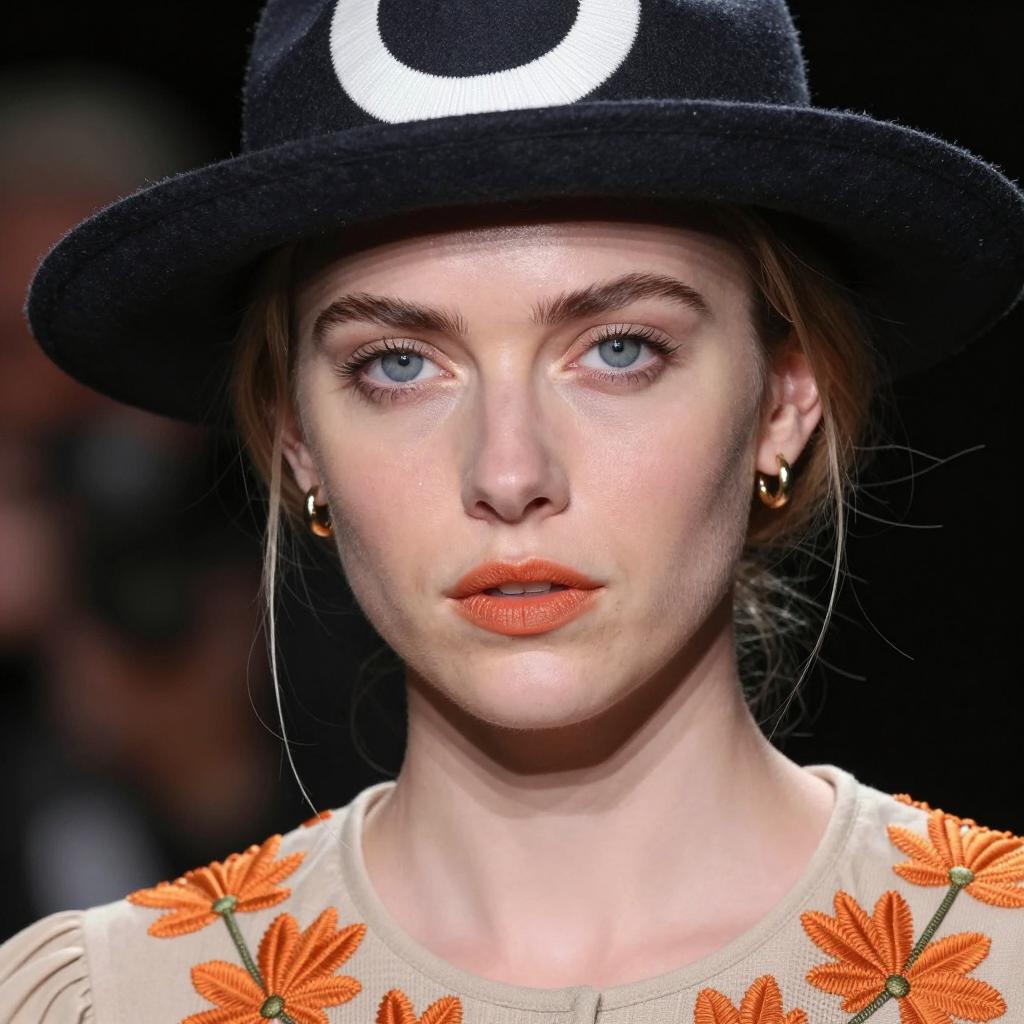 Portrait of a blonde woman with fair skin and striking blue eyes, wearing a sleeveless black dress featuring a ruffled bow-like collar. Her dark burgundy lipstick and slicked-back hair styled in a neat bun create a bold contrast against the dark, blurred background. The lighting emphasizes her intense expression and sharp facial features.