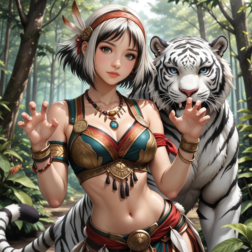 Digital art of an anime-style young woman with white hair, wearing a tribal bikini, standing in a forest with a white tiger behind her.
