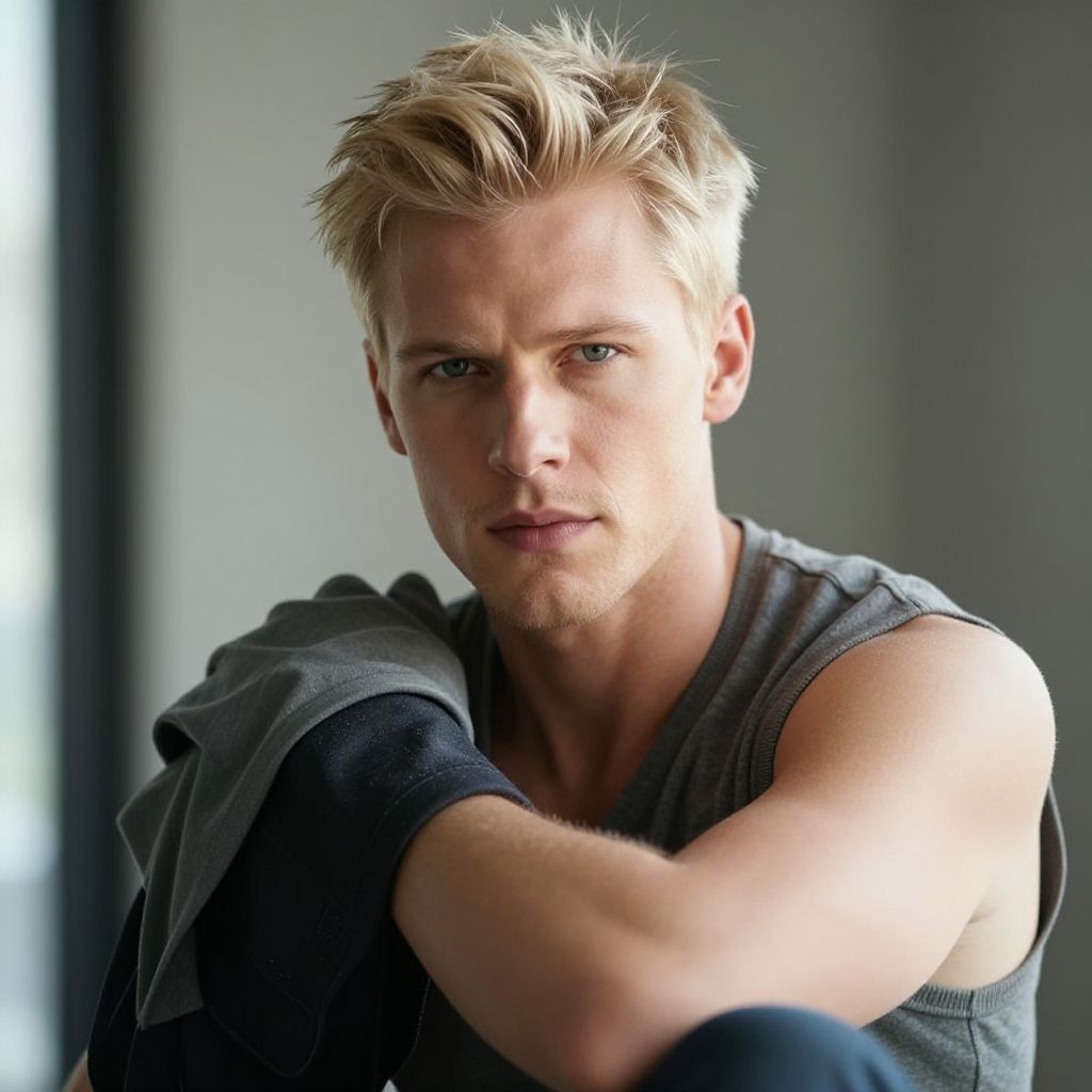 Platinum blonde, fit European man, realistic studio portrait, soft diffused light, modern urban style, clean facial features, professional grooming, high resolution, 4k, 2024, cinematic depth of field, natural hair flow, detailed skin texture, natural expression