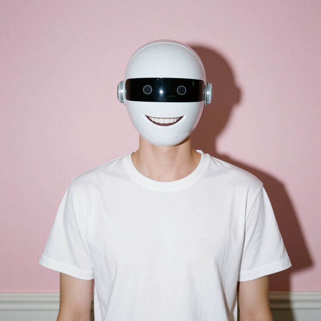 A high definition film photograph of a normal androgynous robot human wearing a plain white t - shirt, in a pastel pink room. happy. visor tech covering eyes. crushed shadows.