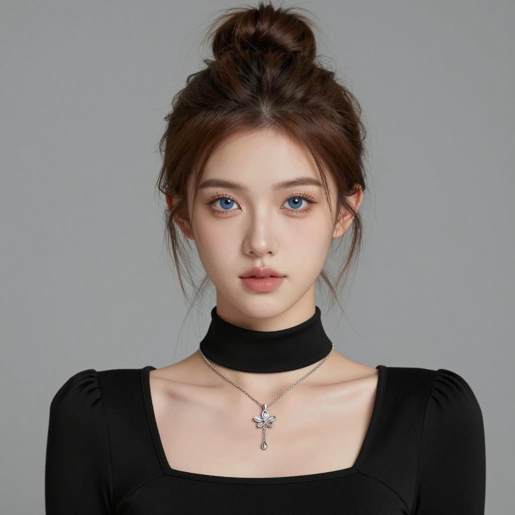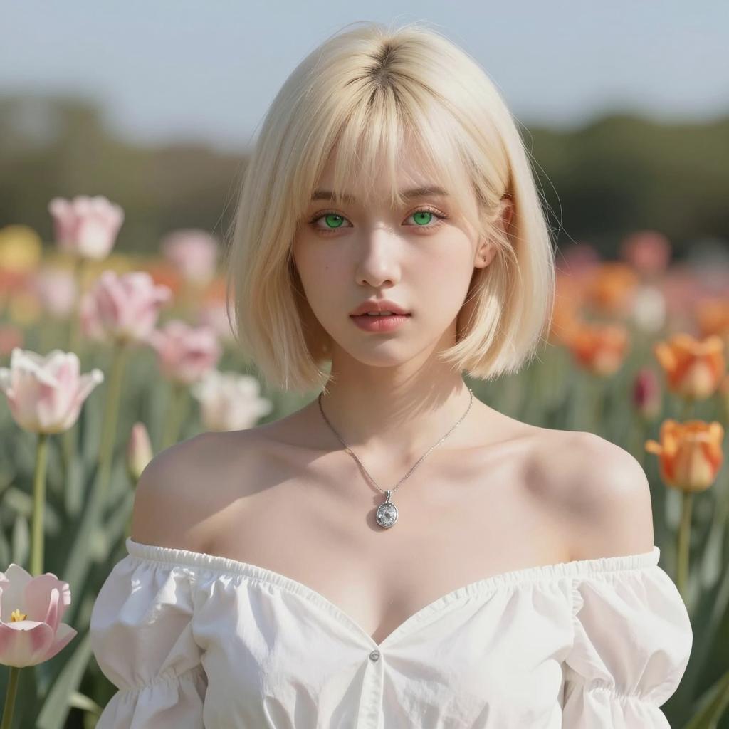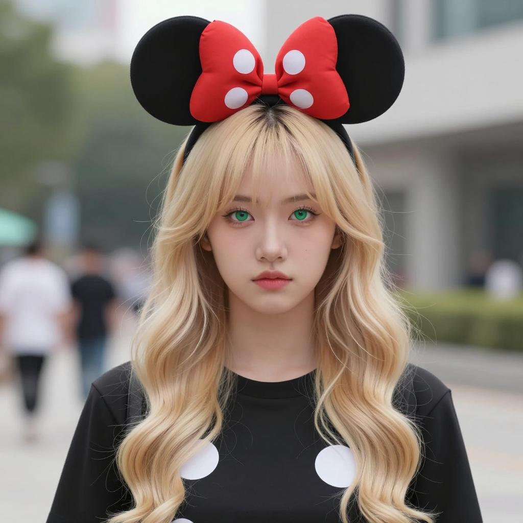 Minnie costume girl, photorealistic, young woman, cosplay, Minnie Mouse costume, black long-sleeve shirt with white circles and red bow, black Minnie Mouse ears with red ribbon, wavy blonde hair, green eyes, light skin, serious expression, blurred outdoor background, daylight, realistic ures, high detail, portrait, front view