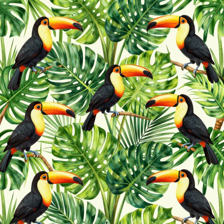 Vibrant tropical birds perch amidst lush green foliage in a seamless wallpaper design, featuring bold toucans with striking orange and black plumage surrounded by monstera leaves and palm fronds.