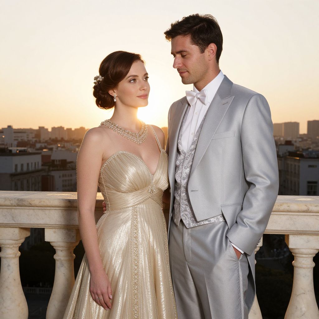 Photograph of a couple standing on a balcony at sunset. The woman, with fair skin and dark brown hair in an elegant updo, wears a shimmering, gold, strapless gown with a deep V-neck and intricate beadwork. The man, with short dark hair and fair skin, is dressed in a light grey tuxedo with a white shirt and a silver vest. He has his hand in his pocket and looks at the woman, who gazes back at him. The background shows a cityscape with buildings silhouetted against a warm, orange sunset. The balcony has white marble balustrades. The image has a romantic, elegant atmosphere.