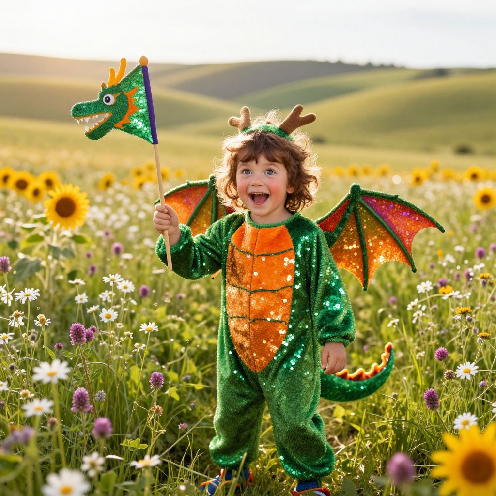 A joyful 7-year-old boy with bright, curly brown hair and big, sparkling eyes stands in a sunny meadow, wearing a detailed green and orange dragon costume with large, colorful wings made of shimmering fabric and sequins that catch the sunlight. His cheeks are flushed with excitement, and he's holding a small flag shaped like a dragon's tail, which gently flutters in the breeze. The scene is set against a backdrop of rolling hills covered in blooming wildflowers—daisies, sunflowers, and purple clover—creating a vibrant, pastoral landscape. Golden sunlight pours over the meadow, gently reflecting off the sequins and adding sparkles to the air, as if the very world is alive with magic. The child’s expression is pure delight, with wide eyes and a small smile, fully immersed in the adventure of being a dragon in the real world.