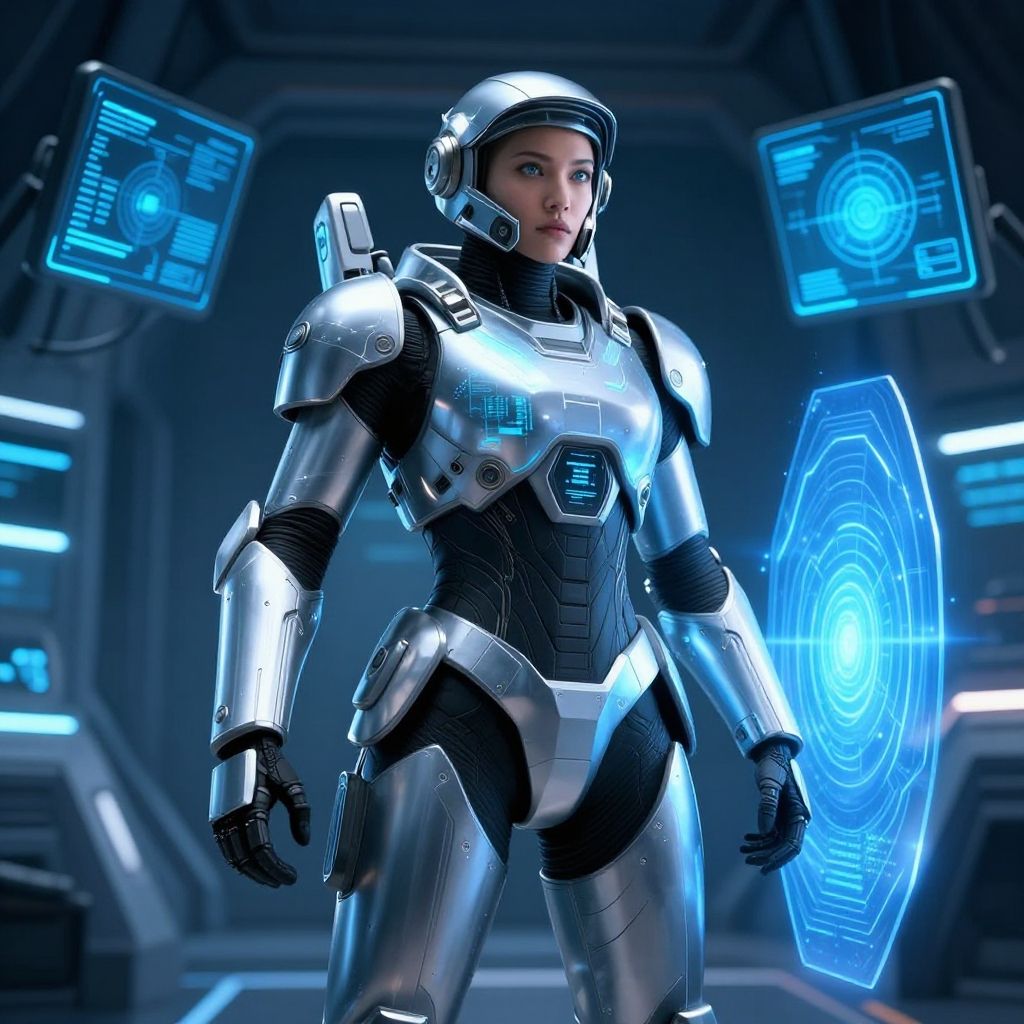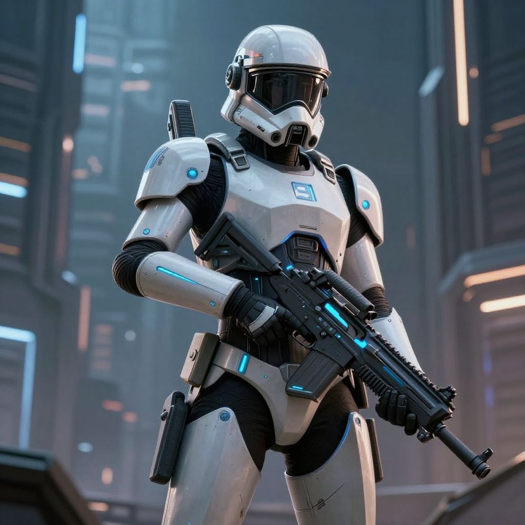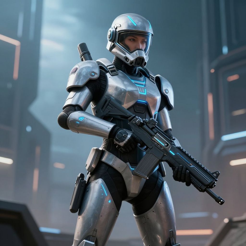 CGI image of a futuristic female soldier in silver armor with blue accents, holding a black rifle, standing in a dimly lit, high-tech city