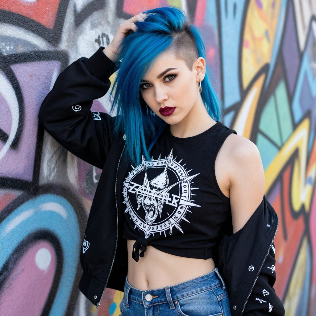 Photograph of a young woman with bright blue, pixie-cut hair and a bold, edgy look. She's wearing a black graphic crop top with white designs, a black jacket with matching patterns, and blue jeans. She's standing against a graffiti-covered wall, with one hand in her hair and a confident expression. Her makeup is bold with dark red lipstick. The graffiti in the background is colorful and abstract.