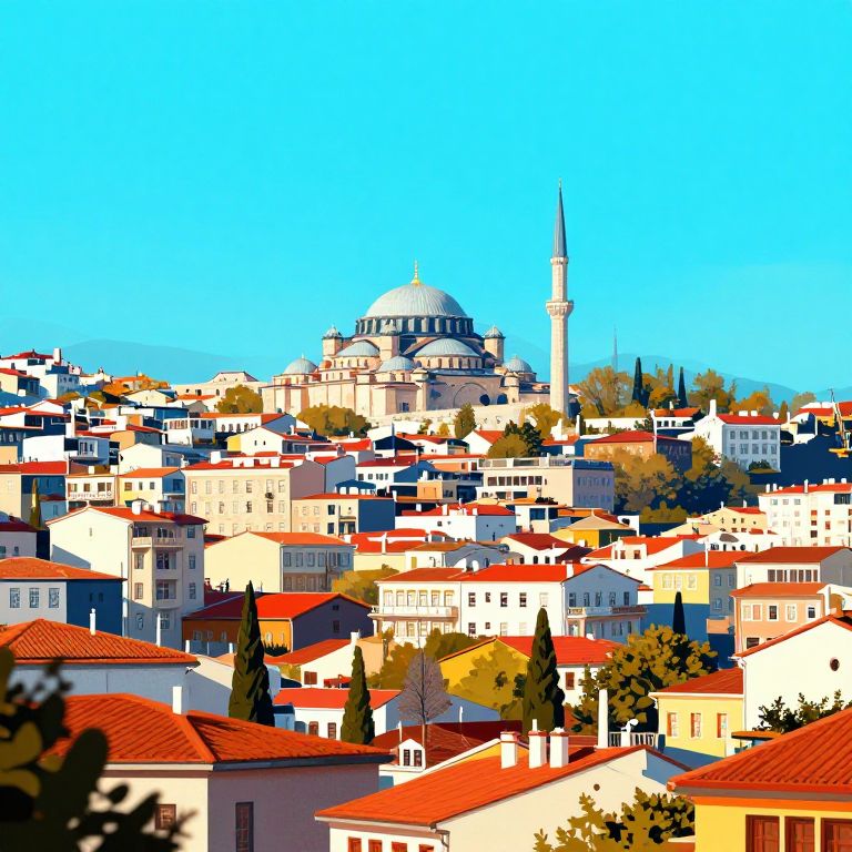 Photograph of Istanbul's skyline featuring a central dome and minaret, surrounded by colorful, red-roofed buildings and greenery under a bright blue