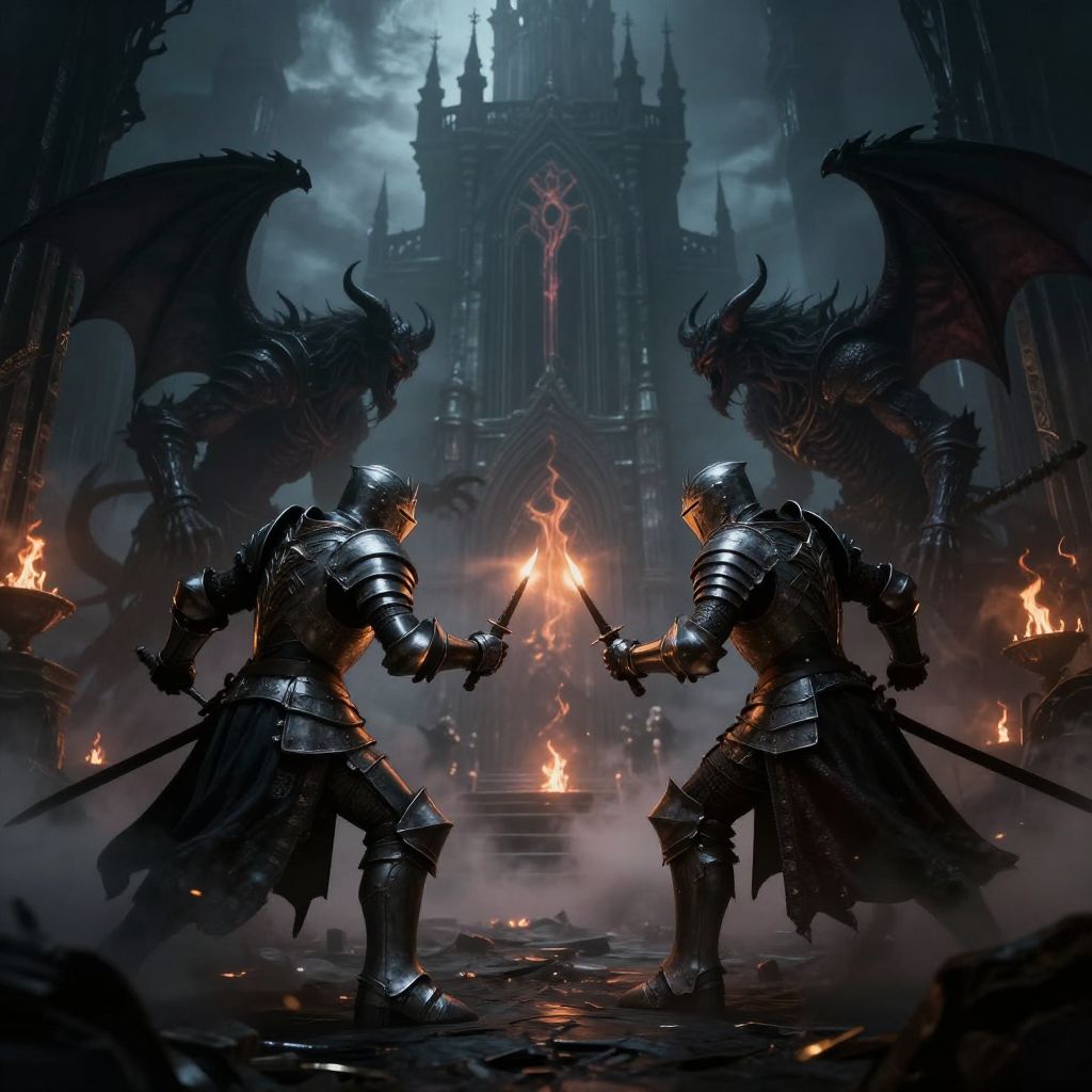 Dark fantasy AI generator envisioning a battle between armored knights and shadow demons in a ruined gothic castle, surrounded by swirling dark mist and flickering magical flames, intricate armor design, dramatic contrast, fantasy art style.