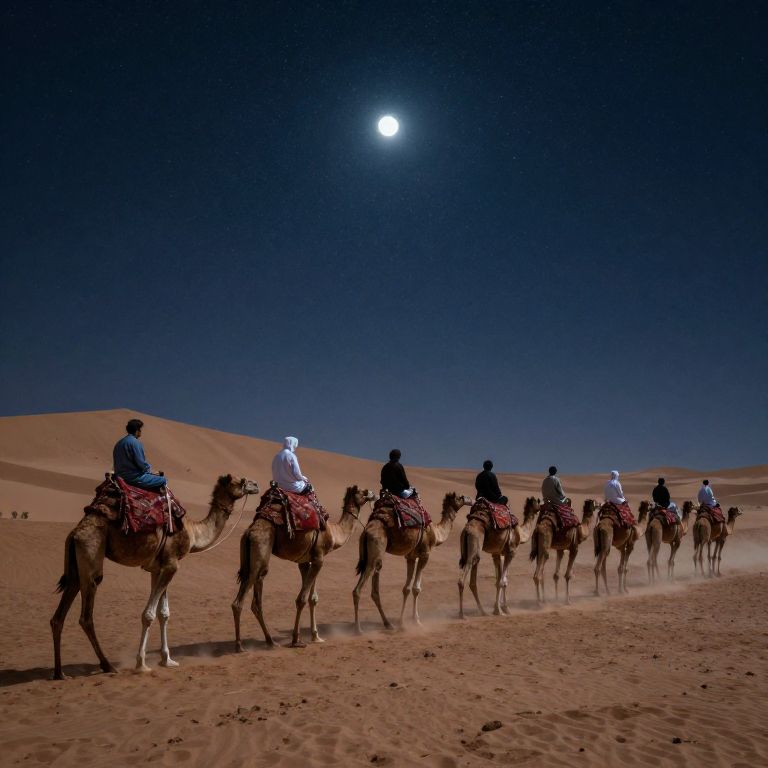 Camel's caravan crossing ancient desert trade route under starry night sky, glowing moon, sand swirling gently around, atmosphere full of mystery and adventure, fine details on camel's saddles and riders' garments, cinematic wide shot.