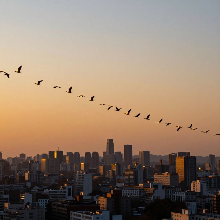 Photograph of a city skyline at sunset with a V-shaped flock of birds flying across a gradient sky from orange to blue.