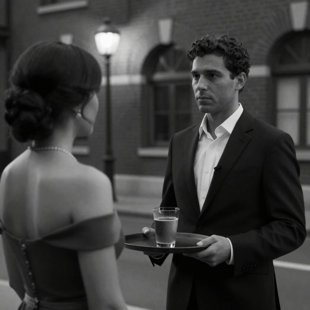 Black-and-white photograph of a man with dark hair and mustache, wearing a tuxedo with a bow tie and flower boutonniere, holding a glass in his right hand, smiling, looking to the left. Background has blurred vertical lines. Two partially visible people on the left and right edges.