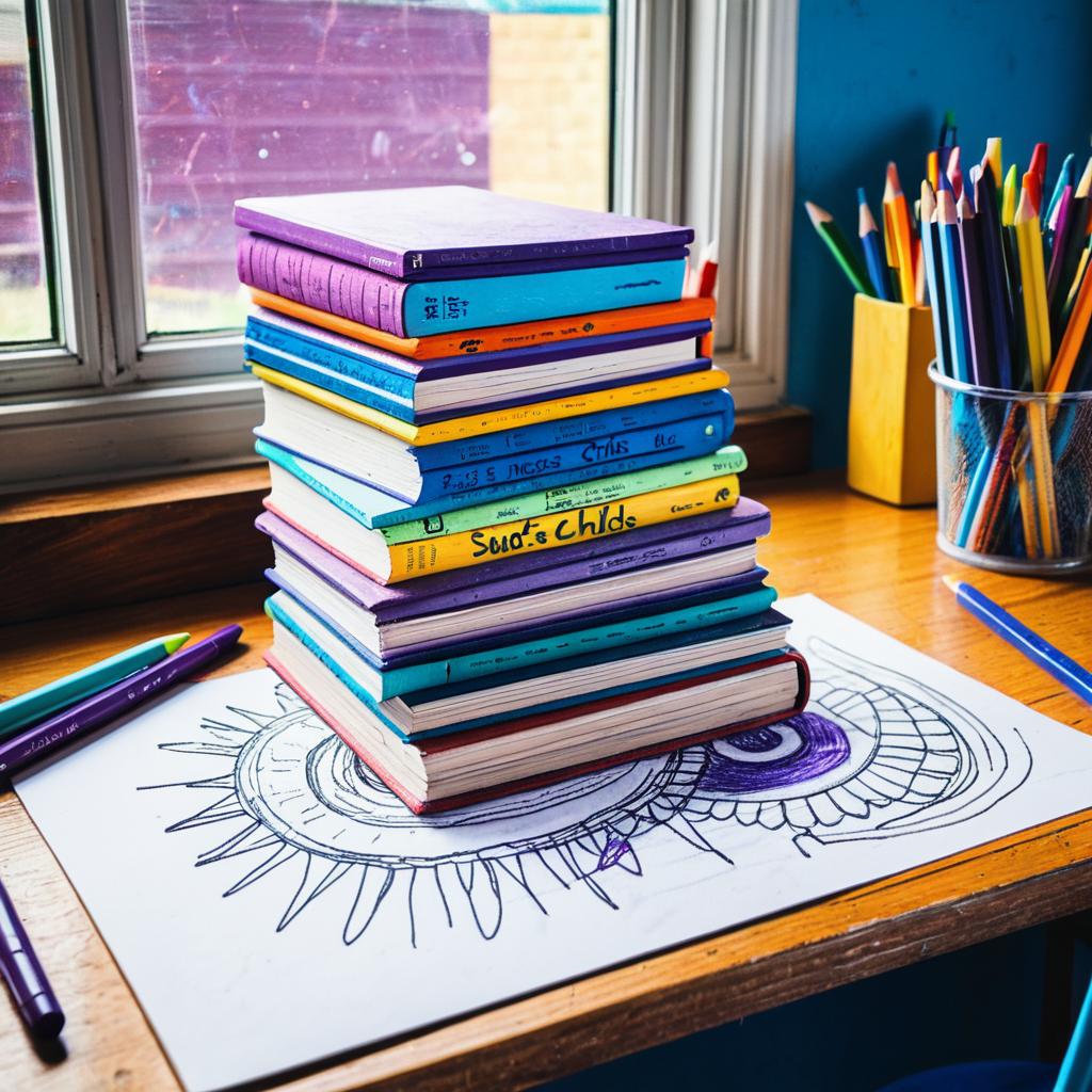 (child's drawing:1.4) of a stack of books, messy scribble drawing, vivid crayons, sun-Drenched classroom corner, purple and blue