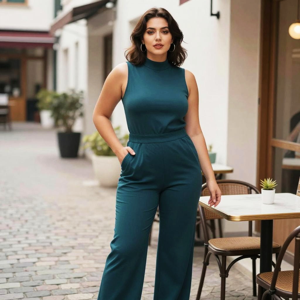 A Plus-size woman in a modern chic rust-colored sleeveless jumpsuit with a V-neck and cinched waist, paired with black strappy high heels, stands under string lights in a desert oasis, embodying the visual style of IDW Publishing. She carries a small rectangular clutch with a striped pattern. Sexy. Pretty face and beutiful eyes