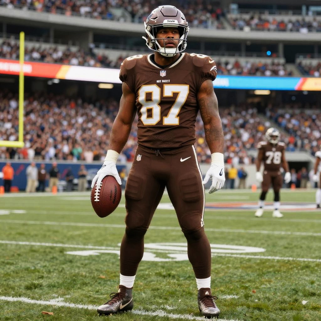 Photograph of a muscular, African-American male NFL player standing on a green football field, wearing a brown Carolina Panthers uniform with the number 87 in white, white gloves, and a white Nike logo on his chest. He holds a football in his right hand, with a focused expression and black helmet with a white logo. In the blurred background, a crowd fills the stadium, and another player in a similar uniform stands to the right. The field has white yard lines, and colorful advertising banners are visible above the stands. Daylight illuminates the scene.