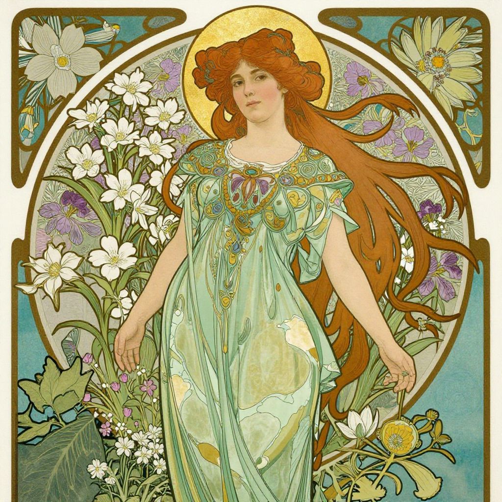 Art Nouveau-style digital drawing of a fair-skinned woman with long, flowing orange hair, wearing a turquoise dress adorned with floral patterns, surrounded by