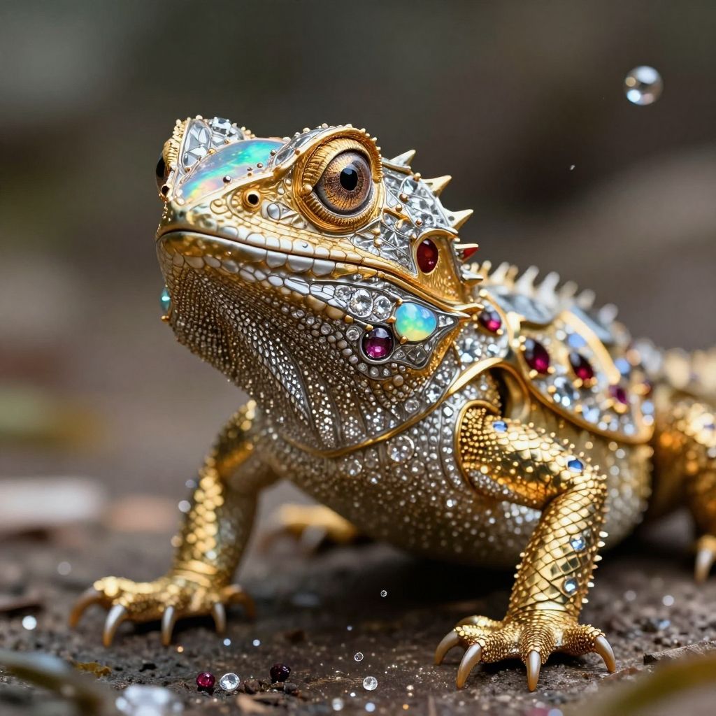 Hyperdetailed Photography, Cinematic, metal lizard, gold, platinum, (detailed face, beautiful eyes), gems, opal, diamons, ruby, (detailed background, pacticles, detailed), (realistic style:1.2)