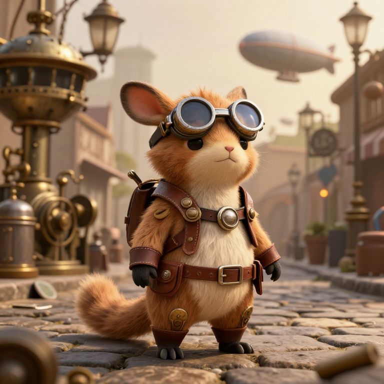 Cute, steampunk-style, brown-furred mouse with goggles and leather harness stands on a cobblestone street with vintage street lamps and blurred
