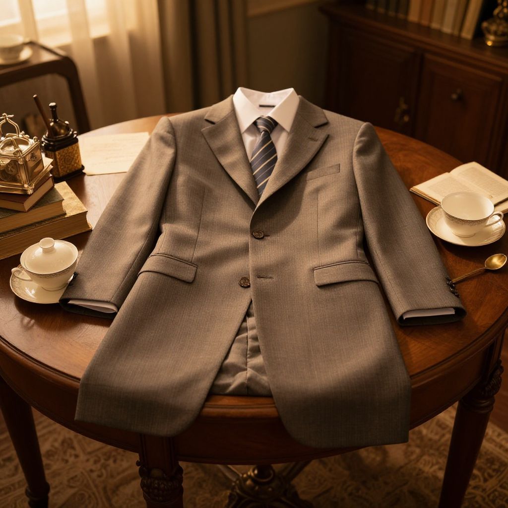 A stylish formal dress for men placed on a wooden table in a vintage-style home office, surrounded by books and a tea set, warm golden hour lighting, nostalgic and classic vibe, detailed fabric texture, MidJourney style realism.