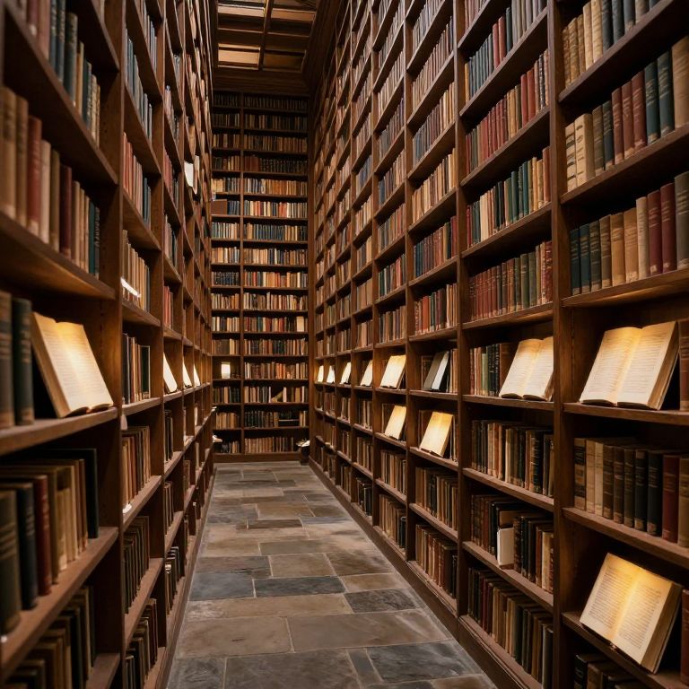 A timeless library where stone-paved pathways lead through endless rows of wooden shelves, each book seemingly alive with the weight of untold stories, while scattered open volumes emit an ethereal glow, hinting at secrets whispered by ancient whispers.