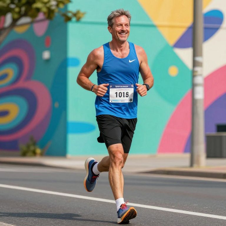 Sustainable Fashion Eckhart Tolle running a marathon, happy, in street-art style, unreal engine 5, hyper-detailed,