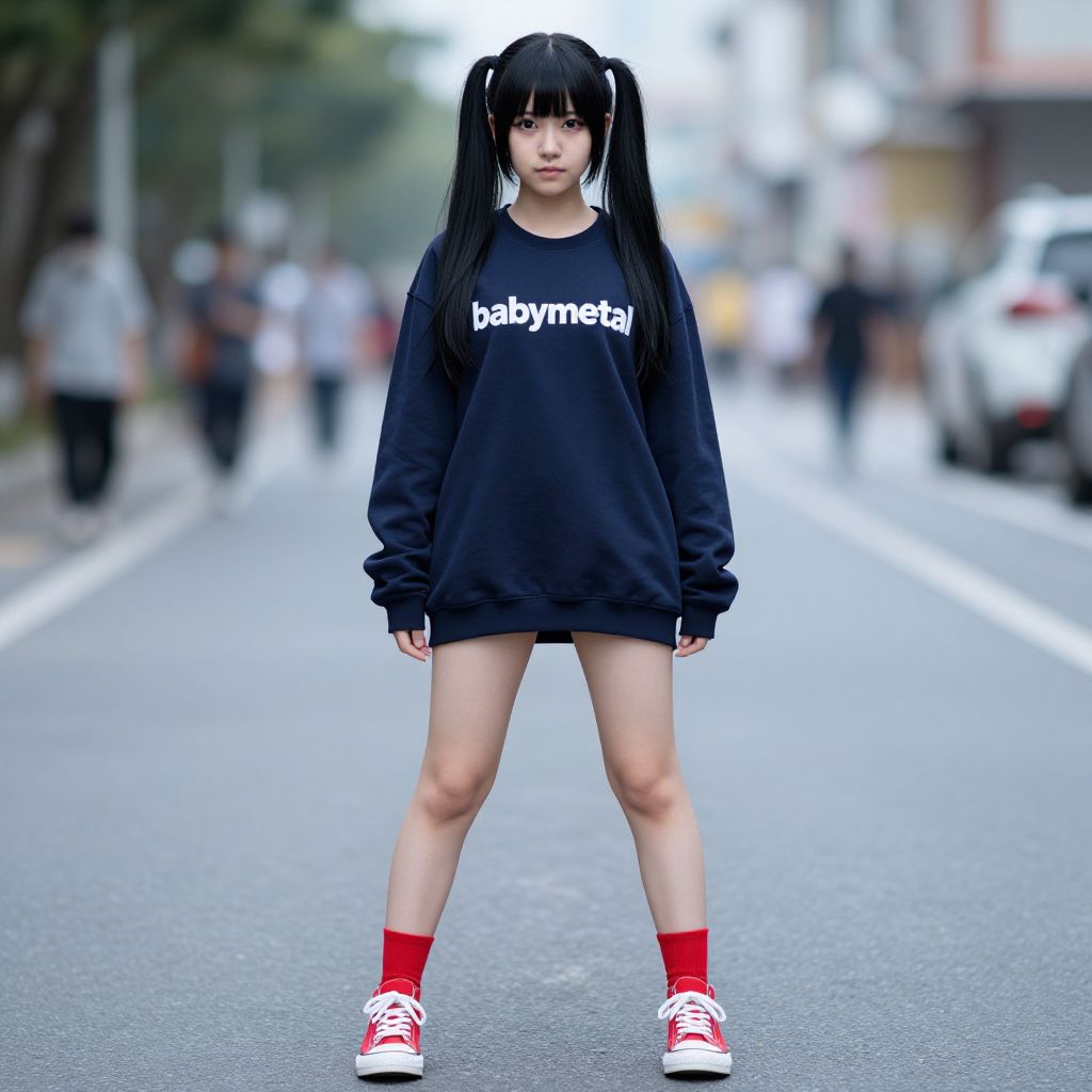 "babymetal cosplay, 1girl, twintails, solo, black hair, outdoors, shoes, sneakers, looking at viewer, standing, blurry background, red footwear, blurry, black eyes, full body, socks, day, long sleeves, closed mouth, arms at sides, blunt bangs, road, street, jacket Realistic photo of casual sexy person with pretty face"