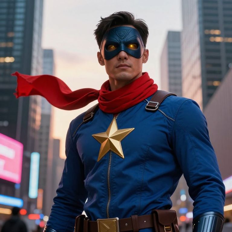 A male superhero standing confidently in a cityscape at sunset, wearing a sleek blue jacket with a brown strap and a golden star prominently displayed on the front. He has a dark, intricate mask covering his face, giving him a mysterious and formidable look, and a vibrant red scarf wrapped around his neck, fluttering slightly in the wind. His eyes are visible through the mask's design, glowing with a subtle golden light, suggesting strength and determination. The background features a dynamic blend of skyscrapers and glowing neon signs, emphasizing the hero's presence in a modern, urban environment. The atmosphere is heroic and inspiring, with a touch of mystique and power.