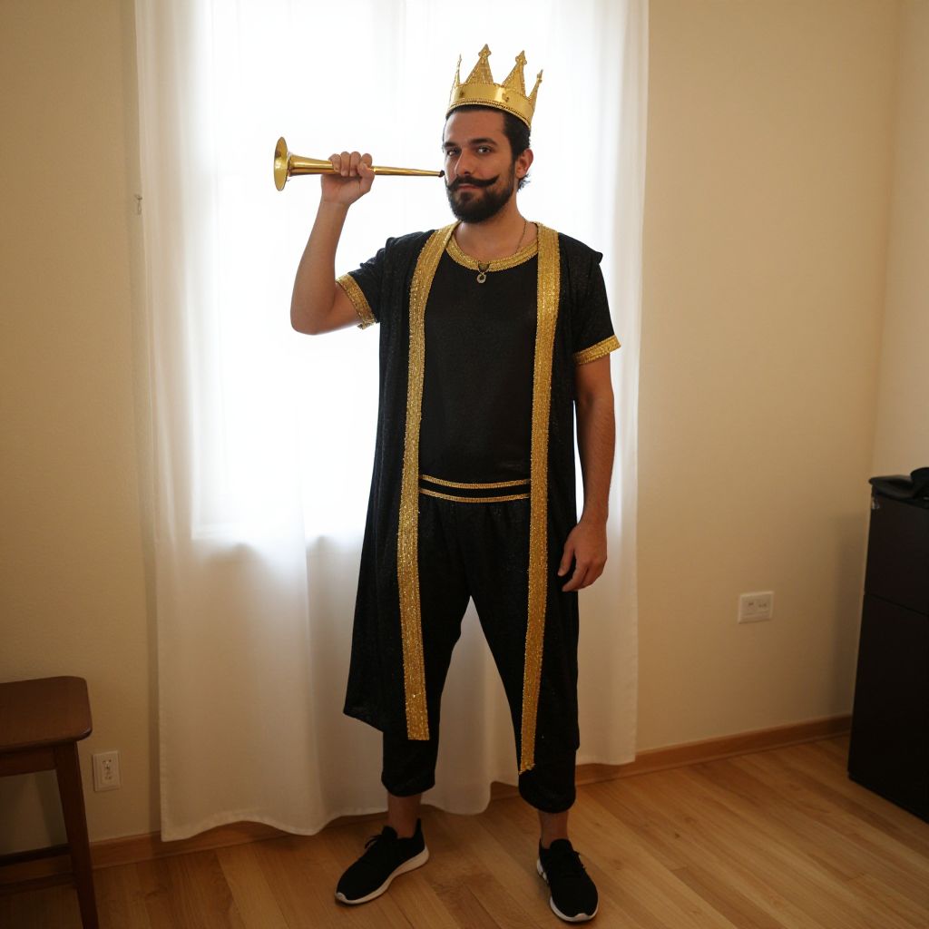 "haman costume purim, 1boy, male focus, solo, facial hair, beard, indoors, mustache, standing, instrument, crown, full body, holding, window Realistic photo of casual sexy person with pretty face"