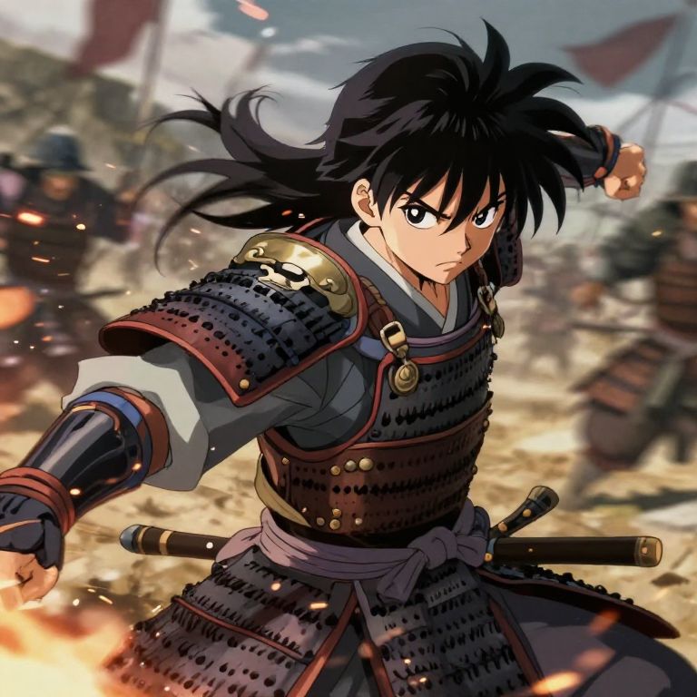 Black hair anime warrior in samurai armor charging through a battlefield, intense action scene with flying sparks and motion blur, dramatic lighting highlighting determined eyes, detailed armor textures blending historical accuracy with stylized anime flair.