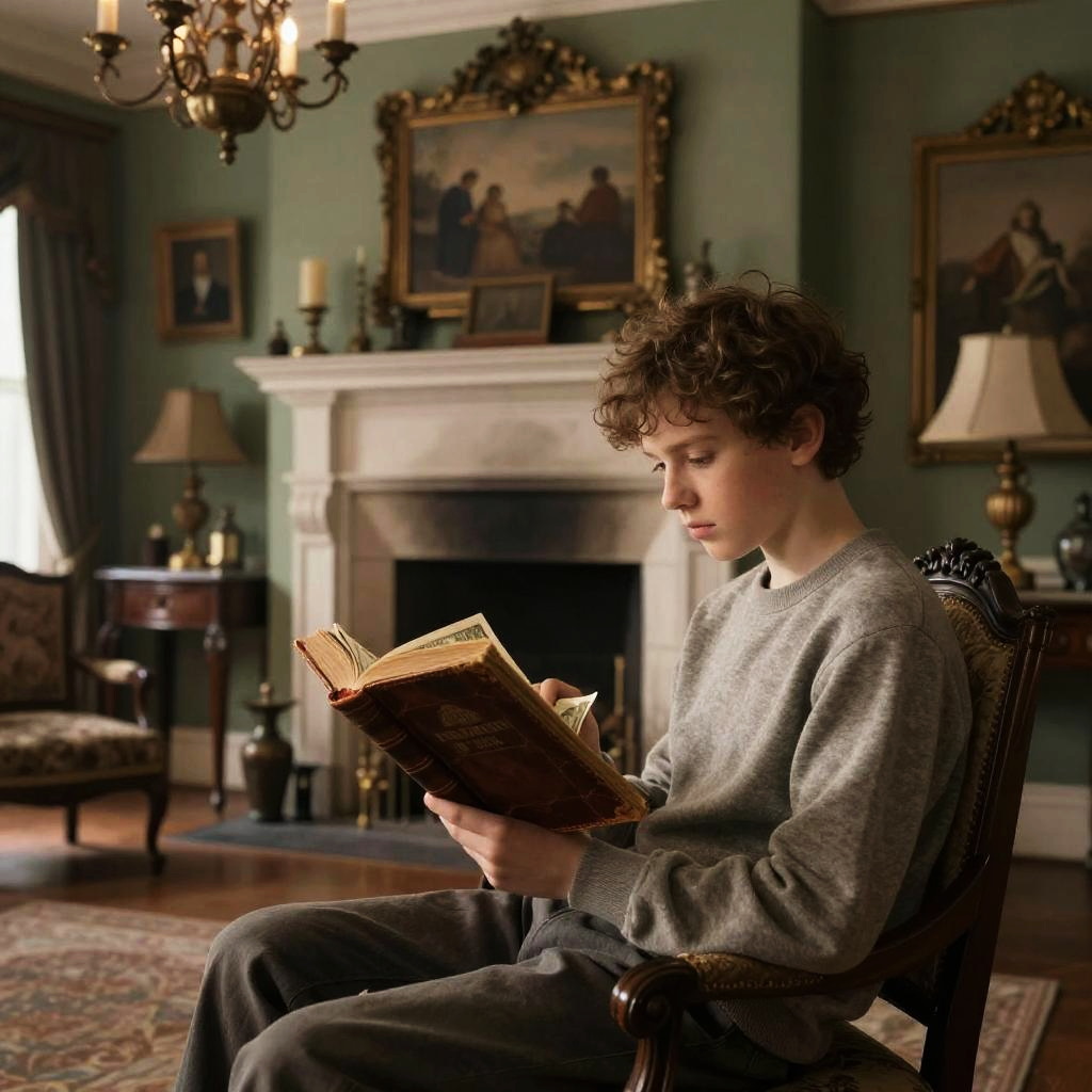 Nerdy librarian in a cozy, dimly lit library filled with towering bookshelves, wearing thick-rimmed glasses and a cardigan, surrounded by stacks of ancient books, vintage style