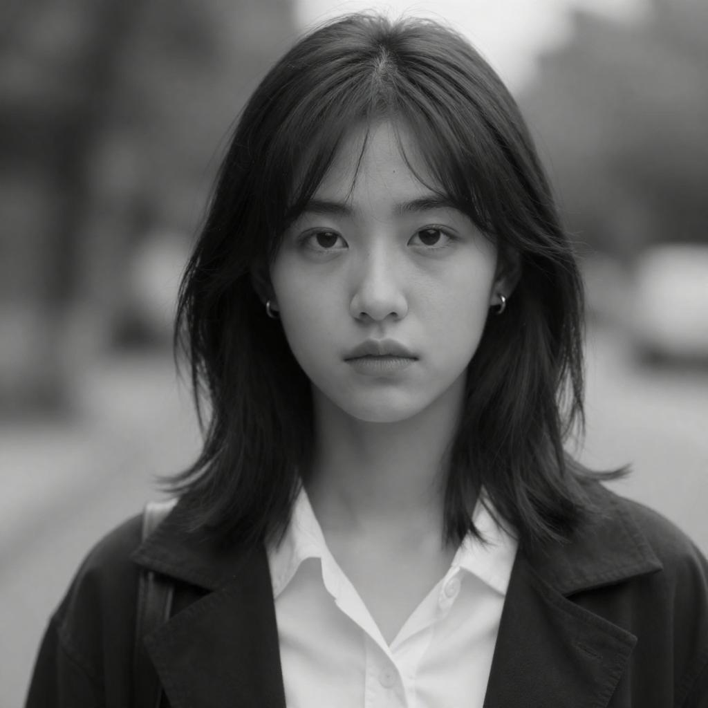 Black-and-white photograph of a young woman with short, wavy hair, wearing a dark suit and pearl bracelet, holding a camera close to her chest. She stands in front of a rustic wooden structure with steps in the background. Her expression is focused and slightly serious.