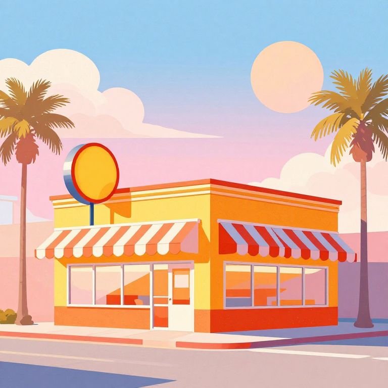 The image presents an abstract, minimalist line art illustration of a 90's fastfood restaurant in Los Angeles. The scene is characterized by a vibrant color-block design, with bold, geometric shapes and soft, impressionist brushstrokes. The restaurant features a striped awning and a large, round sign, both rendered in warm hues of orange and yellow. The building itself is rectangular, with large windows that reflect the surrounding environment. Two palm trees flank the restaurant, their slender trunks and fronds adding a tropical touch to the urban setting. The sky is a gradient of blue and pink, with scattered clouds and a large, circular sun, creating a dreamy, almost surreal atmosphere. The overall composition is balanced, with elements arranged in a way that draws the viewer's eye across the scene, from the restaurant to the trees and back again, creating a sense of depth and perspective.