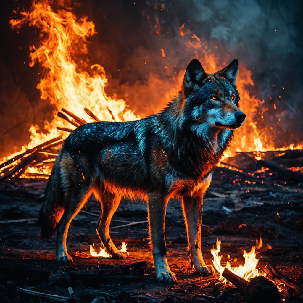 A majestic wolf stands amid a smouldering wasteland with burning embers and intense flames in the background. The wolf's fur is highlighted by vivid fire textures and dramatic atmospheric lighting, emphasizing the contrast between the cool tones of the animal and the warm orange hues of the surrounding fire.