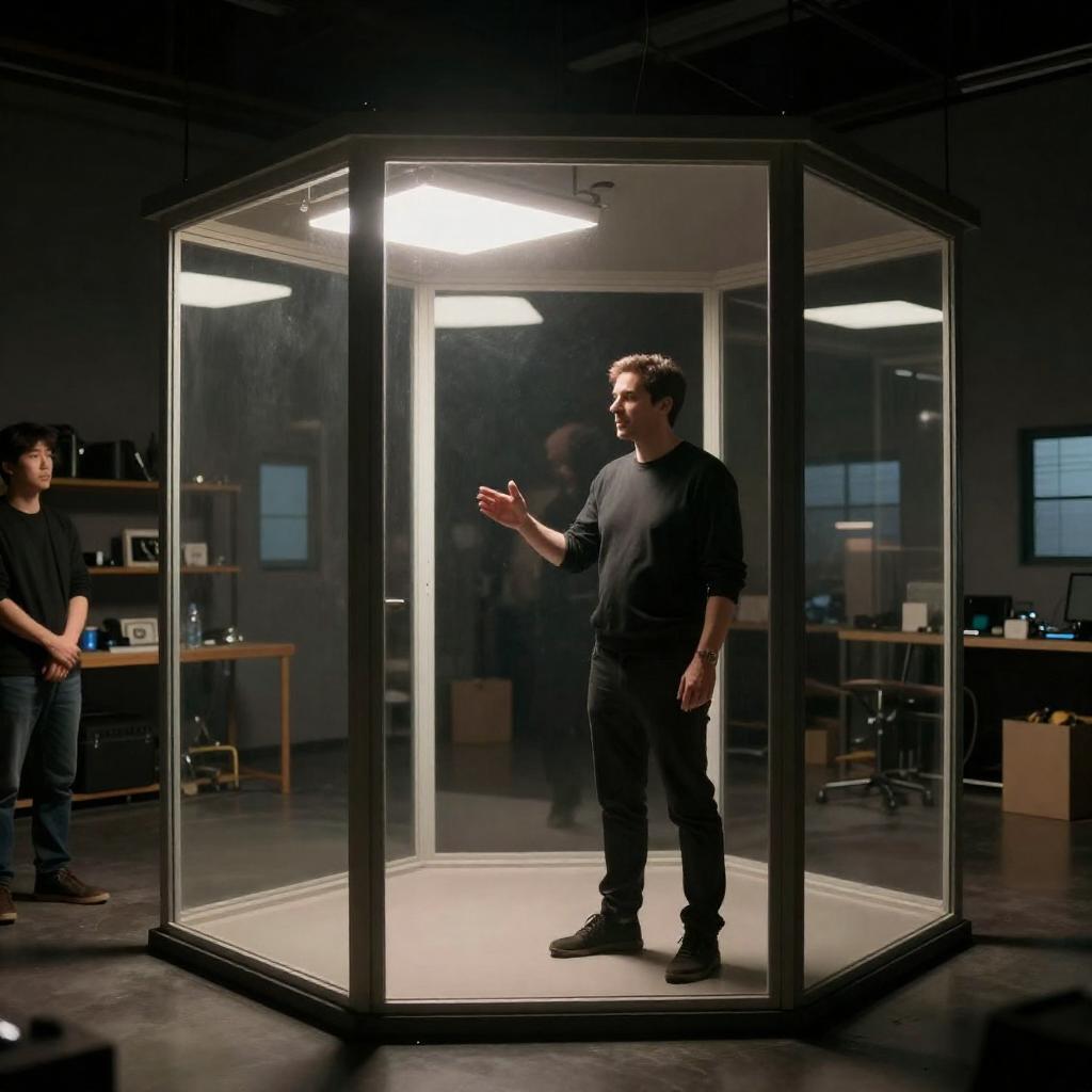 Photograph of a dark, industrial room with a glass-walled enclosure. A man with short hair, wearing a black shirt and pants, stands inside the enclosure, gesturing with his right hand. Bright overhead lights illuminate the scene. Another person is partially visible on the left. The background includes shelves with various objects and a dimly lit wall.