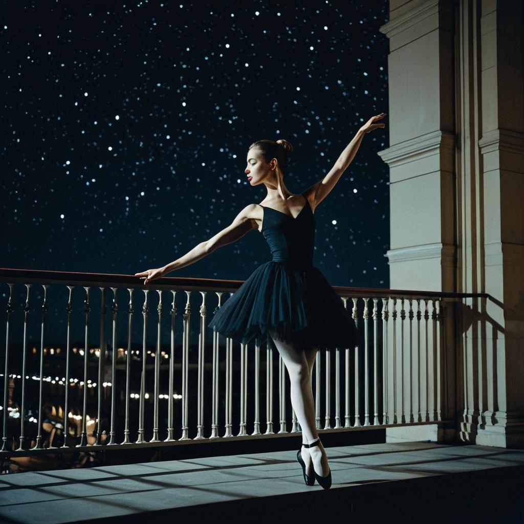 Professional photo of a graceful ballet dancer, in opera house balcony, at night under the stars. Comfortable, glamorous, Rolling Stones Magazine profile, dramatic, cinematic lighting, film noir aesthetic.