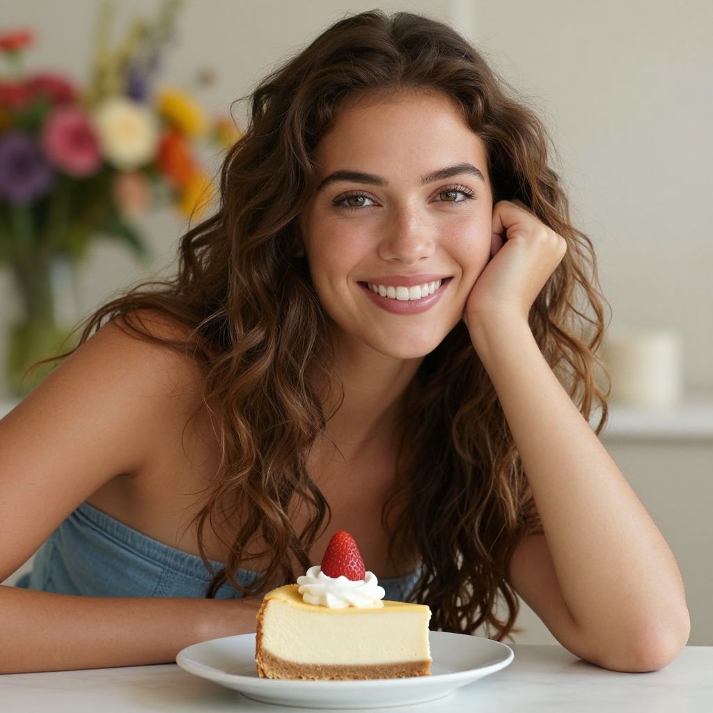 Photograph of a smiling woman with long, wavy brown hair and light skin, leaning on her right hand. She's wearing a strapless, light blue top. In front of her is a white plate with a slice of creamy cheesecake topped with whipped cream and a strawberry. The background is softly blurred with colorful flowers. She looks happy and relaxed, creating a warm and inviting atmosphere.